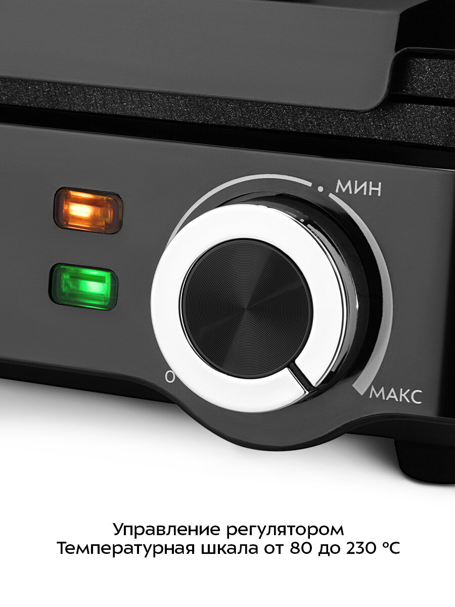 Регулятор является ручкой термостата. Термостат обеспечивает возможность плавно регулировать температуру и поддерживать ее в процессе приготовления. Рядом с регулятором нанесена шкала от 80 до 230 °С.