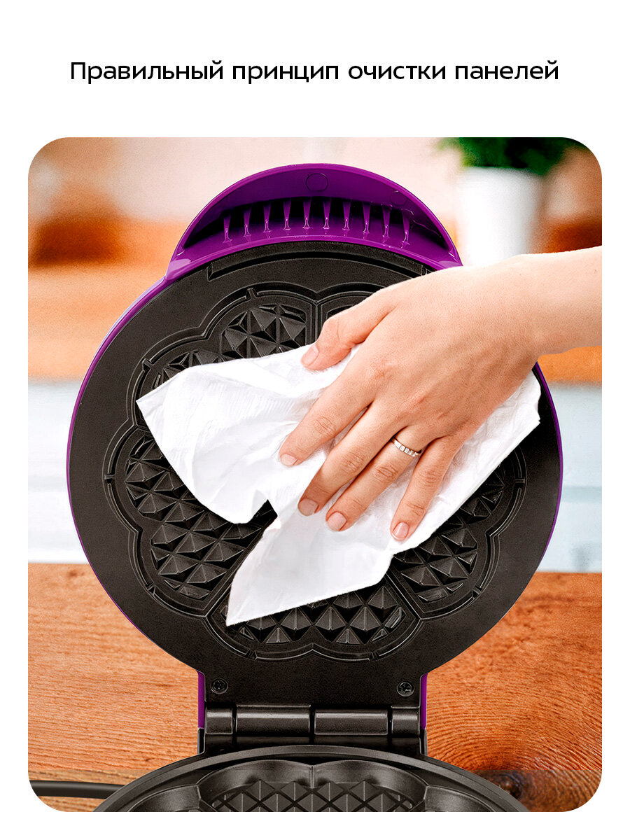 Очищайте панели бумажными полотенцами, удаляя остатки теста. Затем протрите мягкой влажной тканью. При сильных загрязнениях используйте немного мягкого моющего средства. Избегайте абразивных средств, чтобы не повредить антипригарное покрытие.