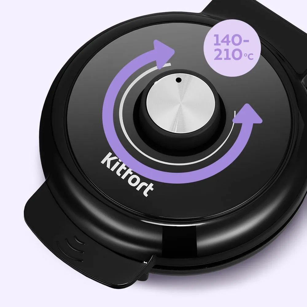 С помощью регулятора можно выбирать температуру от 140±10°С до 210±10°С. Вафельница оснащена индикаторами питания и нагрева, а также термостатом для поддержания температуры панелей.