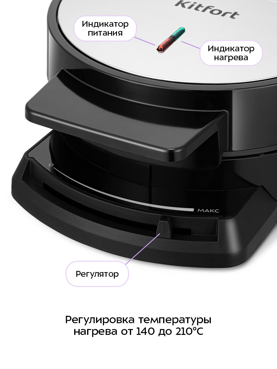 Вафельница оснащена регулятором нагрева, с помощью которого вы можете плавно настроить температуру приготовления вафель от 140±10°С до 210±10°С. Индикатор работы горит, когда прибор включен в сеть, а индикатор нагрева покажет, когда панели разогреются.