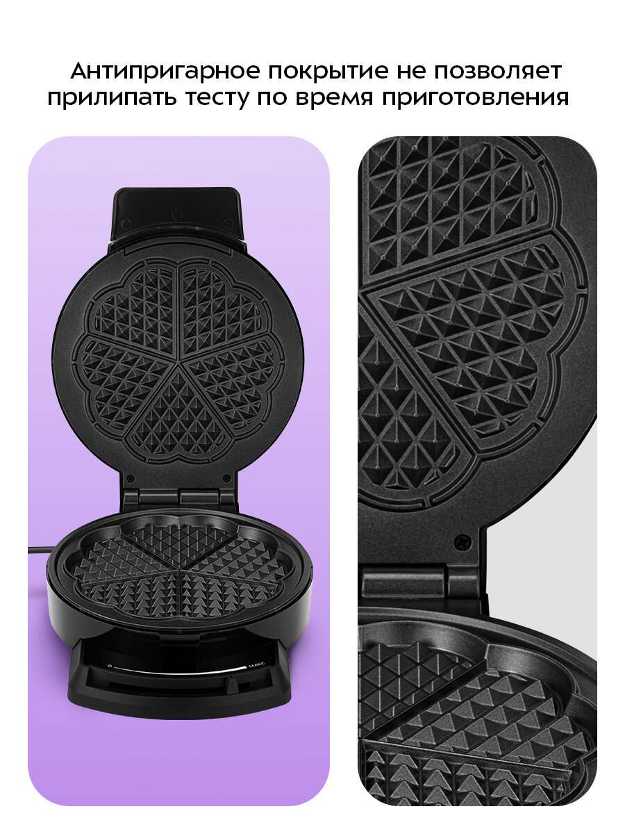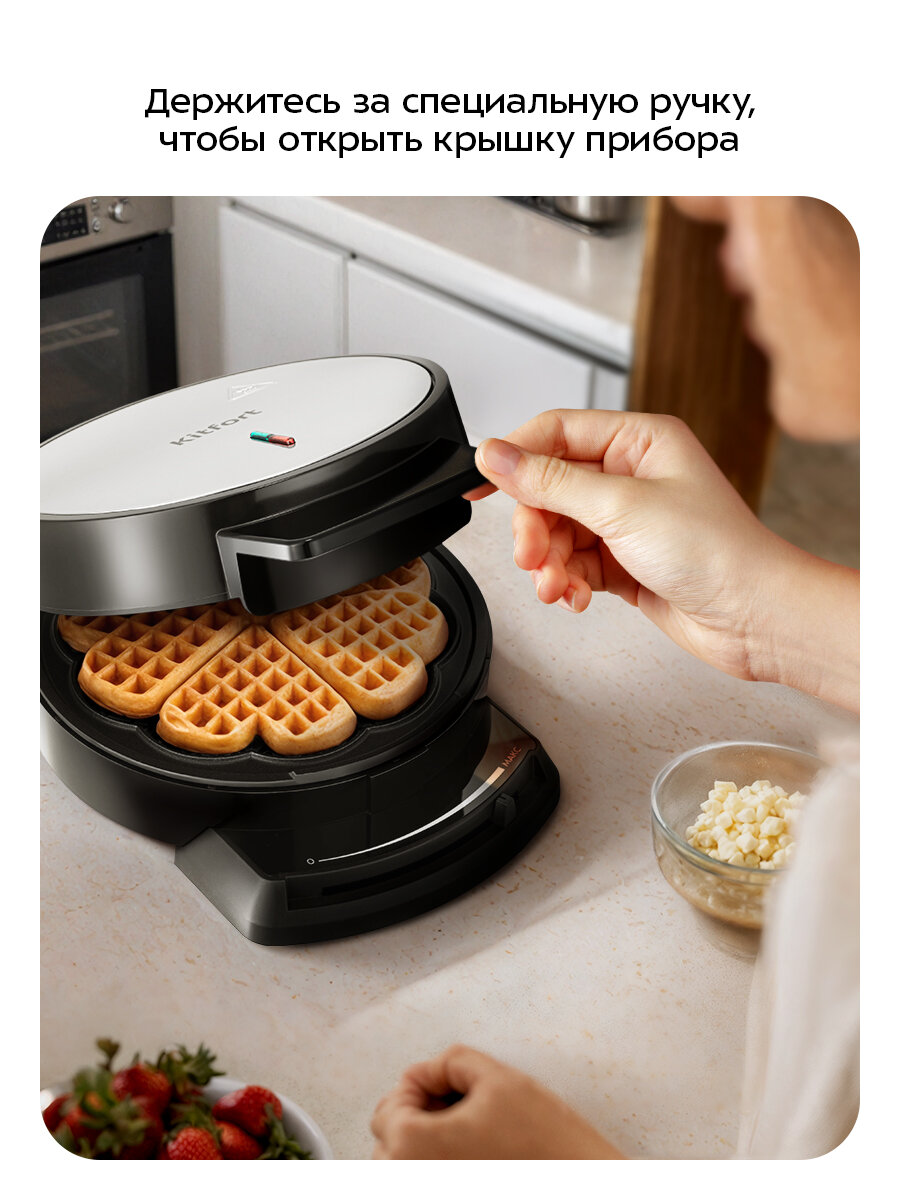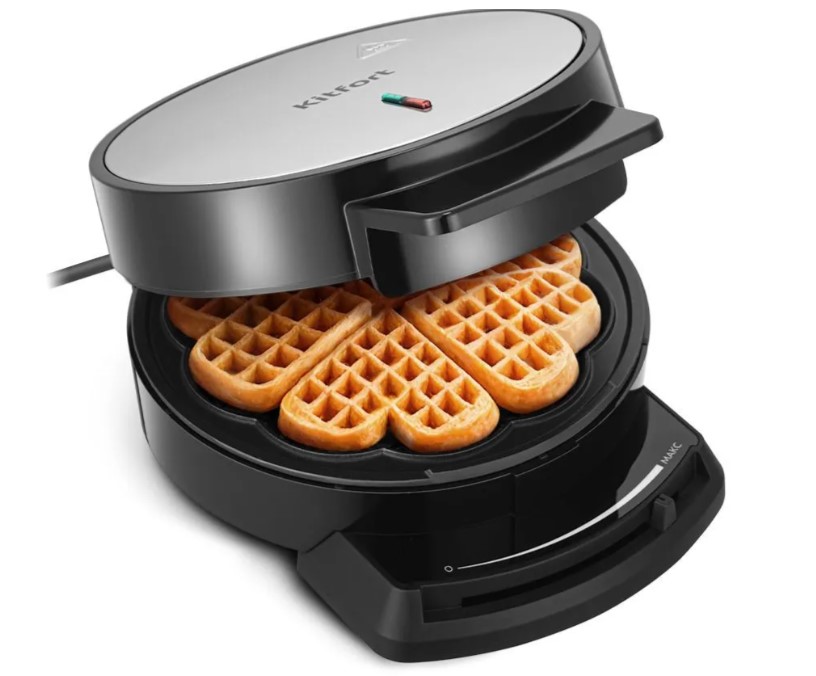 С электрической вафельницей КТ-5616 вы получите 1 готовую вафлю в форме цветка за одно приготовление. Готовую вафлю легко разделить на 5 аккуратных сердечек — красиво, вкусно и удобно. После приготовления добавьте ягоды и фрукты, и домашний десерт готов!