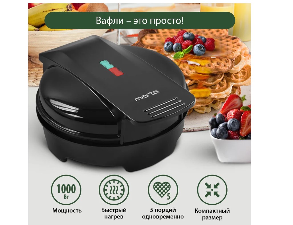 Вафельница MARTA MT-1760 - это отличный компактный прибор для быстрого приготовления вафель. Для наилучшего пропекания в конструкции реализован равномерный прогрев рабочей поверхности с антипригарным покрытием. Не нагревающиеся ручки позволяют использовать вафельницу без риска обжечься, а система защиты от перегрева исключает повреждение прибора. Вафельница снабжена индикаторами работы и нагрева, а также специальными ножками для устойчивости.
