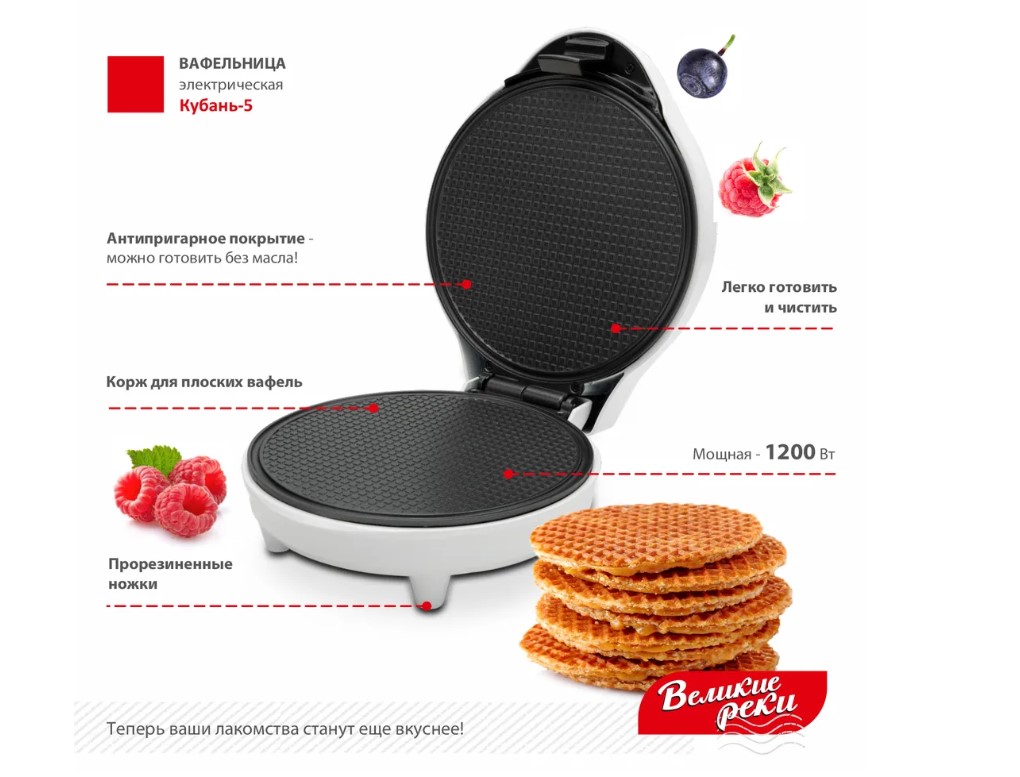 Вафельница Кубань-5 поможет быстро приготовить хрустящие вафельные трубочки для любой начинки. Готовые вафли можно подавать с мороженым, с ягодами, джемом, с шоколадной пастой, или сделать вафельный торт с кремом или со сгущенкой. В вафельнице так же можно изготовить тонкие сырные вафли, вафли из кабачков или тыквы, можно приготовить горячие бутерброды, или тосты.