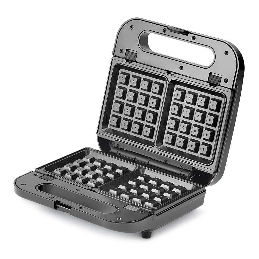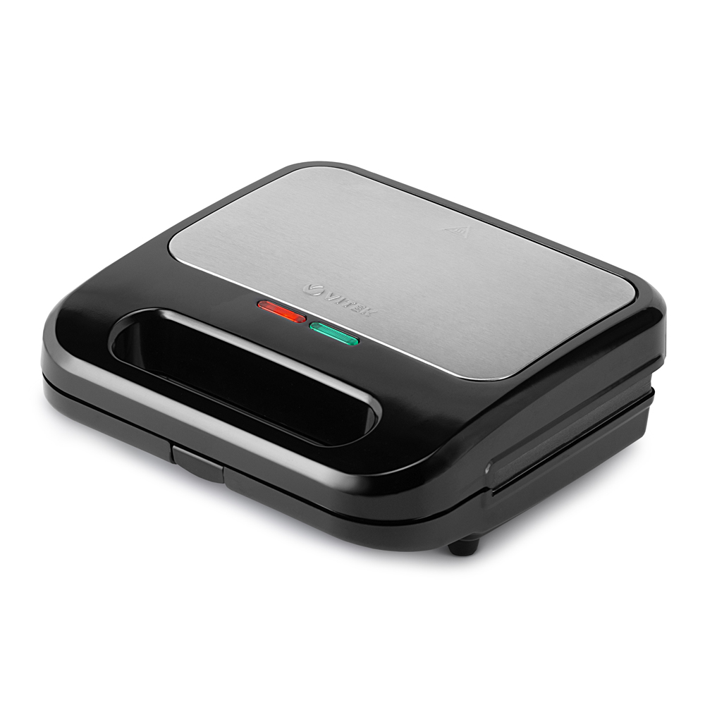 Теперь о компактном приборе с различными функциями можно не только мечтать, ведь вафельница VT-7148 вполне отвечает этим характеристикам! В приборе предусмотрено 4 комплекта съемных пластин с антипригарным покрытием, которые помогут вам приготовить не только нежнейшие вафли, но и блюда на гриле, а также испечь основу для любимых «орешков» со сгущенкой. Специальные индикаторы сообщат о включении вафельницы и ее готовности к работе. А для особой безопасности вафельница оснащена зажимом-блокировкой.