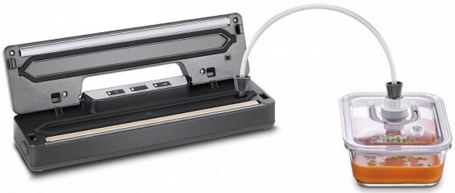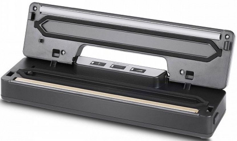 Имеет широкую тефлоновую ленту запаивания, длиной 30 см и электронный контроль температуры. Качественный ABS пластик и передняя панель крышки из нержавеющей стали убережет вакууматор от падения посторонних предметов. Вакуумный упаковщик устойчив к пятнам и царапинам, легко очищаются мягкой тканью.