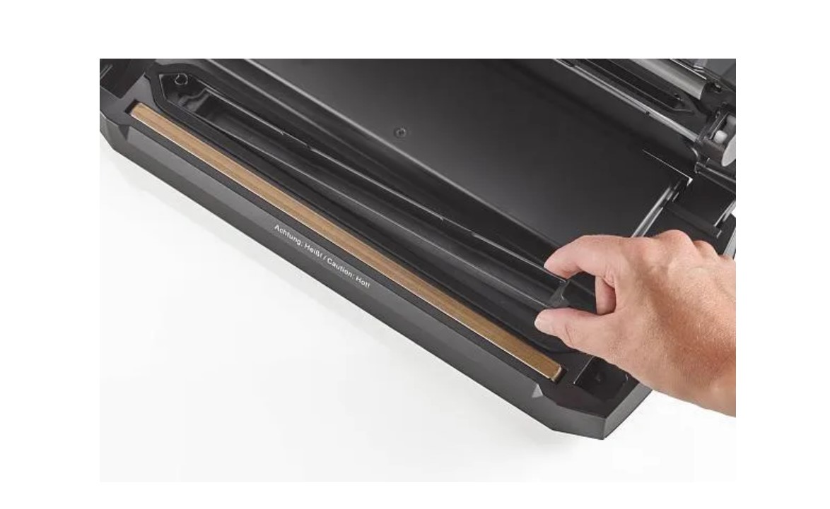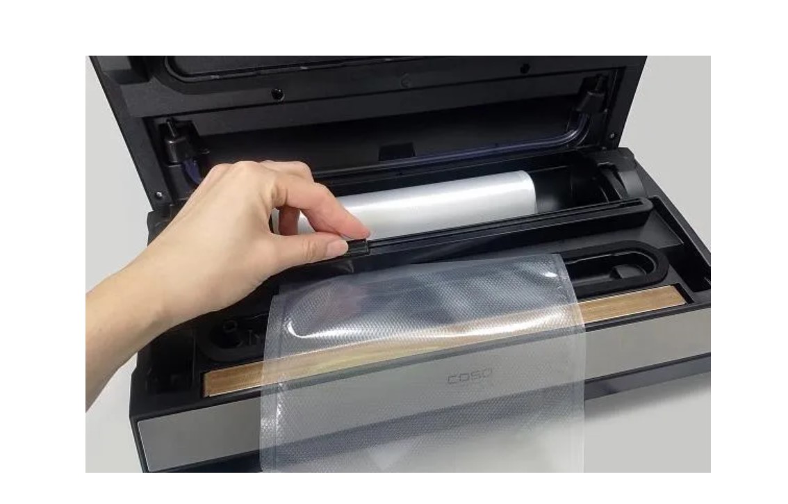 Вакууматор позволяет изготовить пакеты необходимой длины — для этого предусмотрены отсек для рулонов и резак. Чтобы отрезать пакет, достаточно положить рулон в отсек, вытянуть часть пленки и потянуть ползунок ножа. Затем положить открытым краем на сварную планку и запаять.