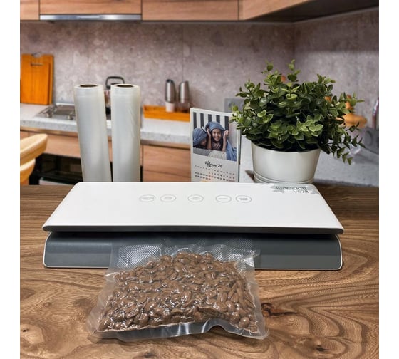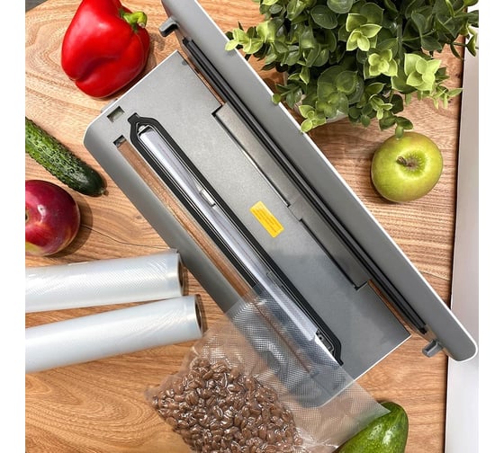 вакууматор, стартовый набор пакетов, встроенный резак, инструкция, гарантийный талон,; комплект для откачки воздуха из бутылок и контейнеров