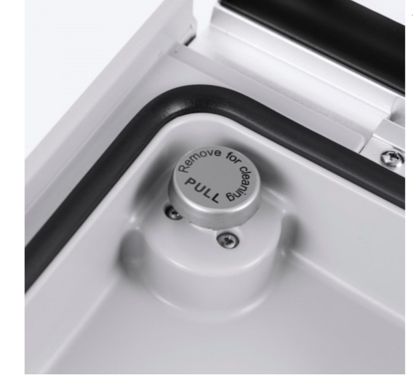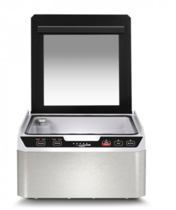 Корпус выполнен из нержавеющей стали с прозрачной крышкой из закаленного стекла. Прорезиненные ножки позволяют надежно зафиксировать упаковщик на любой, даже на влажной, поверхности.