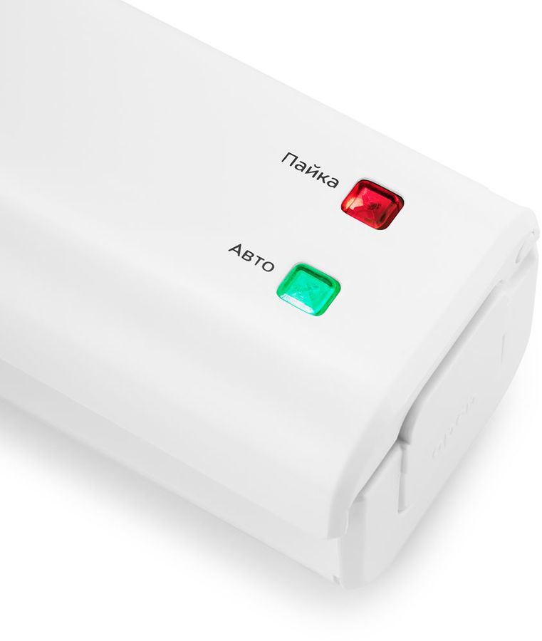 Прибор может работать в 2 режимах. При нажатии кнопки «Авто» вакууматор автоматически откачивает воздух из пакета, а затем запаивает его. А с помощью кнопки «Пайка» устройство запаяет пакет без вакуумирования.