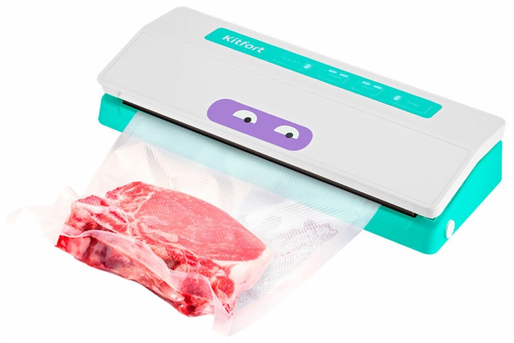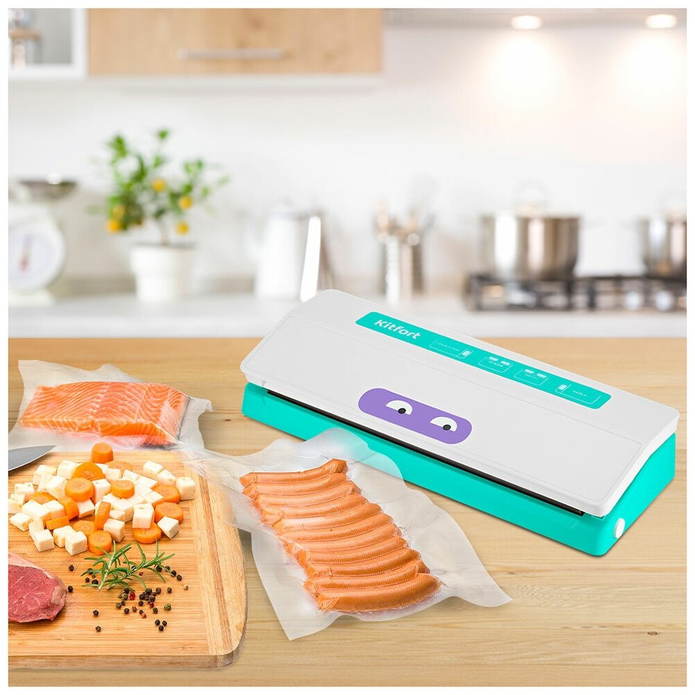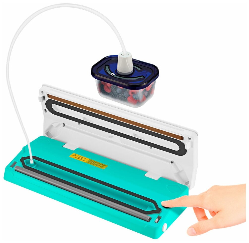 В комплектации идут 5 пакетов для вакуумирования размерами 28х35 см и 5 пакетов размерами 22х30 см. У вакууматора внутри находится фитинг для подсоединения шланга, с помощью которого можно вакуумировать еду в контейнеры.