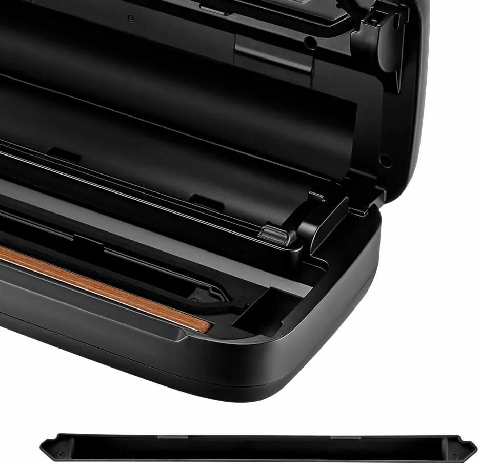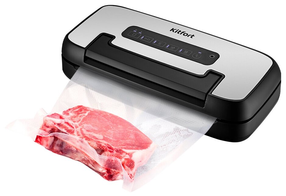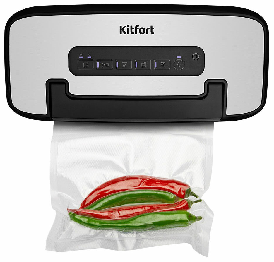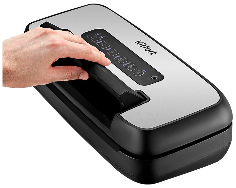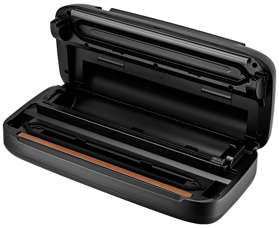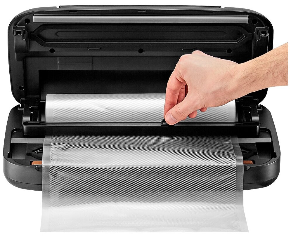 Рулон вакууумной плёнки входит в комплект с устройством. Рядом с панелью управления расположен фитинг для подсоединения шланга, с помощью которого можно вакуумировать еду в контейнеры.
