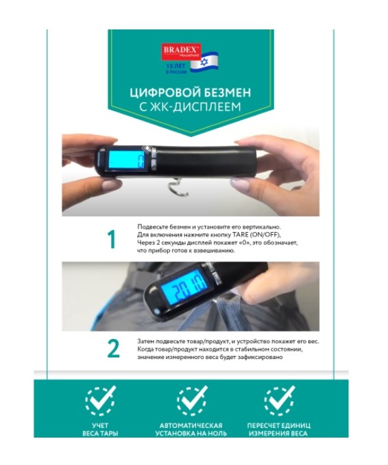 Цифровой безмен – это очень удобное, портативное, стойкое к вибрации устройство. Оно максимально точно отображает вес благодаря большому ЖК-дисплею с голубой подсветкой. Цифровой безмен оснащен рядом полезных функций, как: учет веса тары, автоматическая установка на ноль, автоматическое выключение, пересчет единиц измерения веса и т.д. Прибор будет особенно полезным в домашних делах, во время отдыха на природе или совершения покупок. Цифровой безмен – это идеальный инструмент для взвешивания нового поколения!
