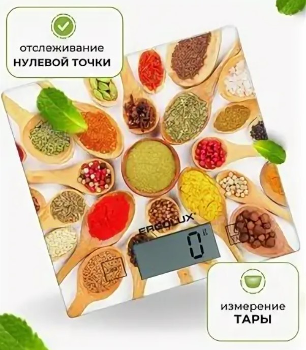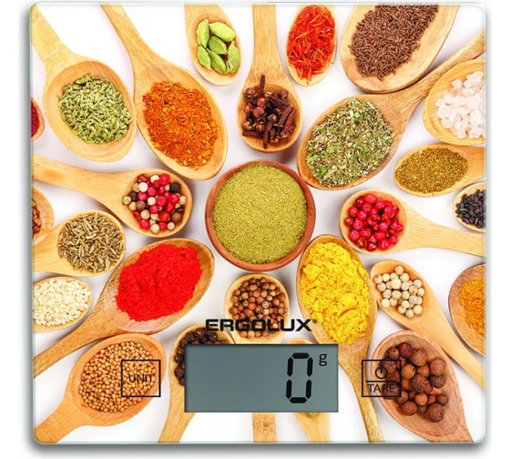 Кухонные весы ERGOLUX ELX-SK01-С11 яркие приправы, до 5 кг, 150х150 мм 14361 используются для определения веса сухих, жидких и сыпучих продуктов. Точность измерения - 1 грамм.