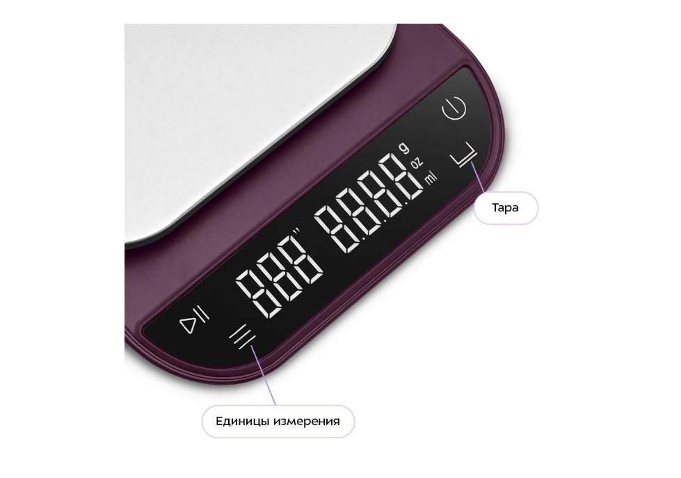 Весы оснащены дисплеем и 4 кнопками управления – можно задать таймер, поменять единицы взвешивания или обнулить вес тары. В верхнем правом углу расположена кнопка включения и выключения весов.