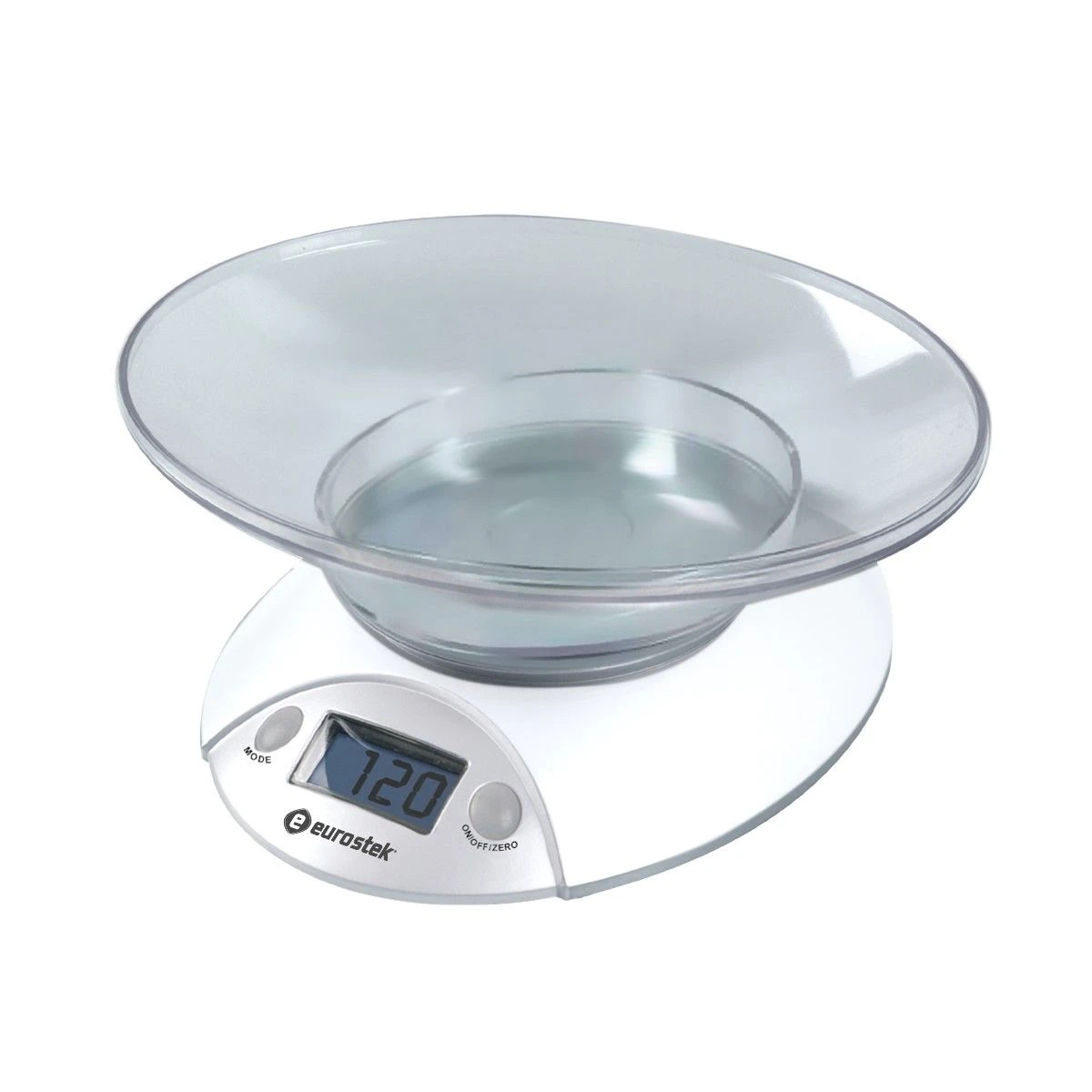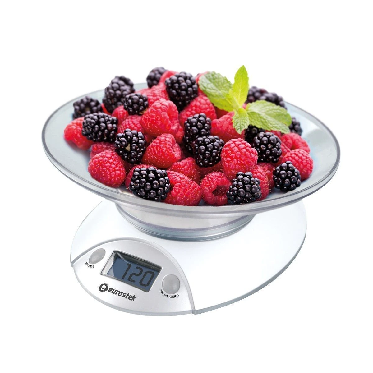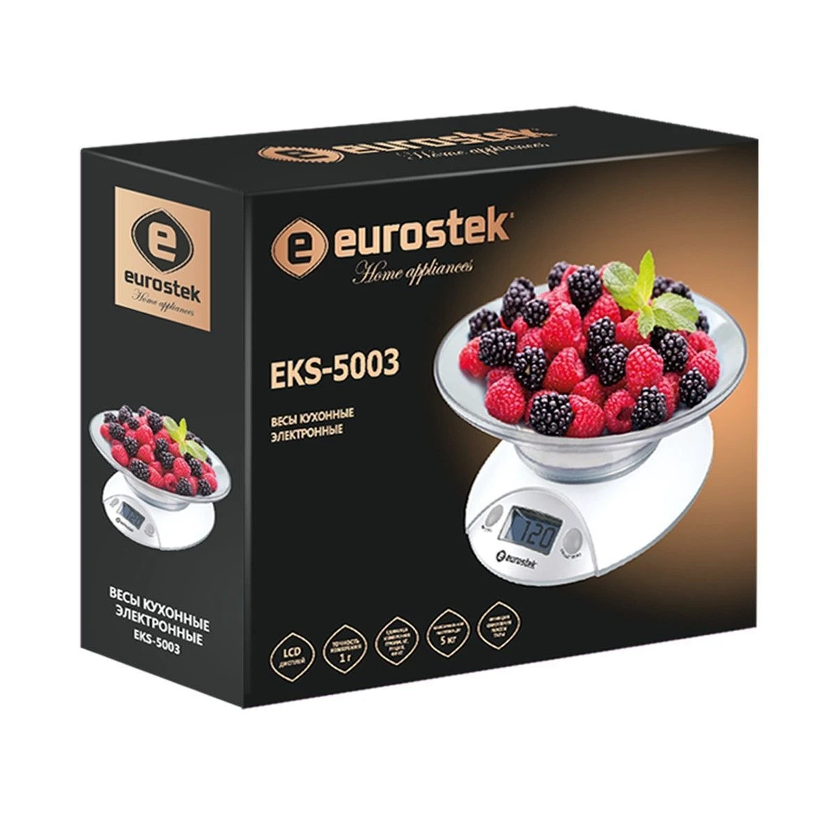 Весы кухонные электронные Eurostek EKS-5003, максимальный вес до 5 кг, ЖК-дисплей с LED-подсветкой, Функция обнуления массы тары, Автовключение/отключение, Единица измерения: грамм, кг, унция, фунт, Точность измерения 1 гр, питание от батареек - 1 литиевая батарейка в комплекте.