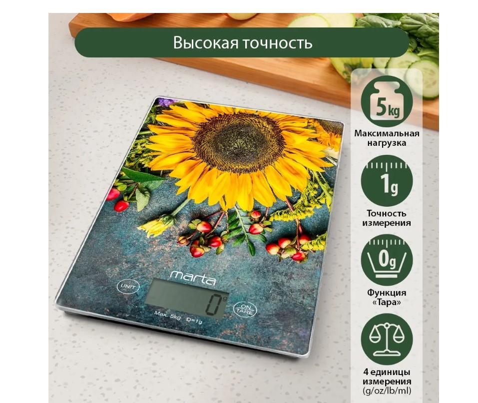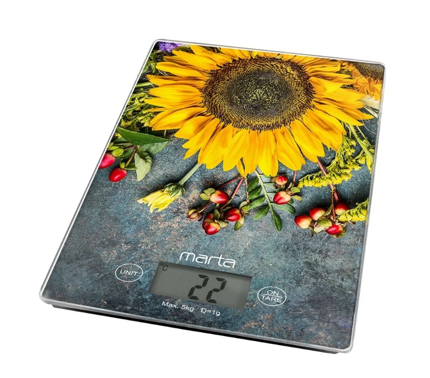 Яркие кухонные весы с красивой и прочной поверхностью из закаленного стекла, большим жидкокристаллическим дисплеем, функцией «ТАРА» и встроенной функцией индикации температуры помещения. Весы обеспечивают надежное взвешивание продуктов массой до 5 килограммов с точностью до 1 грамма и способны работать в различных единицах измерения (граммы, килограммы, унции, фунты, миллилитры). Функция «ТАРА» позволяет не учитывать массу посуды при взвешивании продуктов, а индикаторы перегрузки и замены батареи сделают работу весов бесперебойной в течение длительного времени. Для экономии заряда литиевой батарейки (входящей в комплект поставки) весы отключаются автоматически, если не используются. Кухонные весы – отличный помощник для тех, кто любит готовить точно по рецептам.