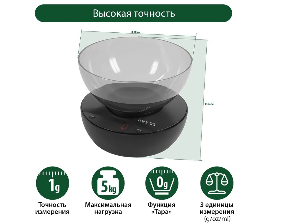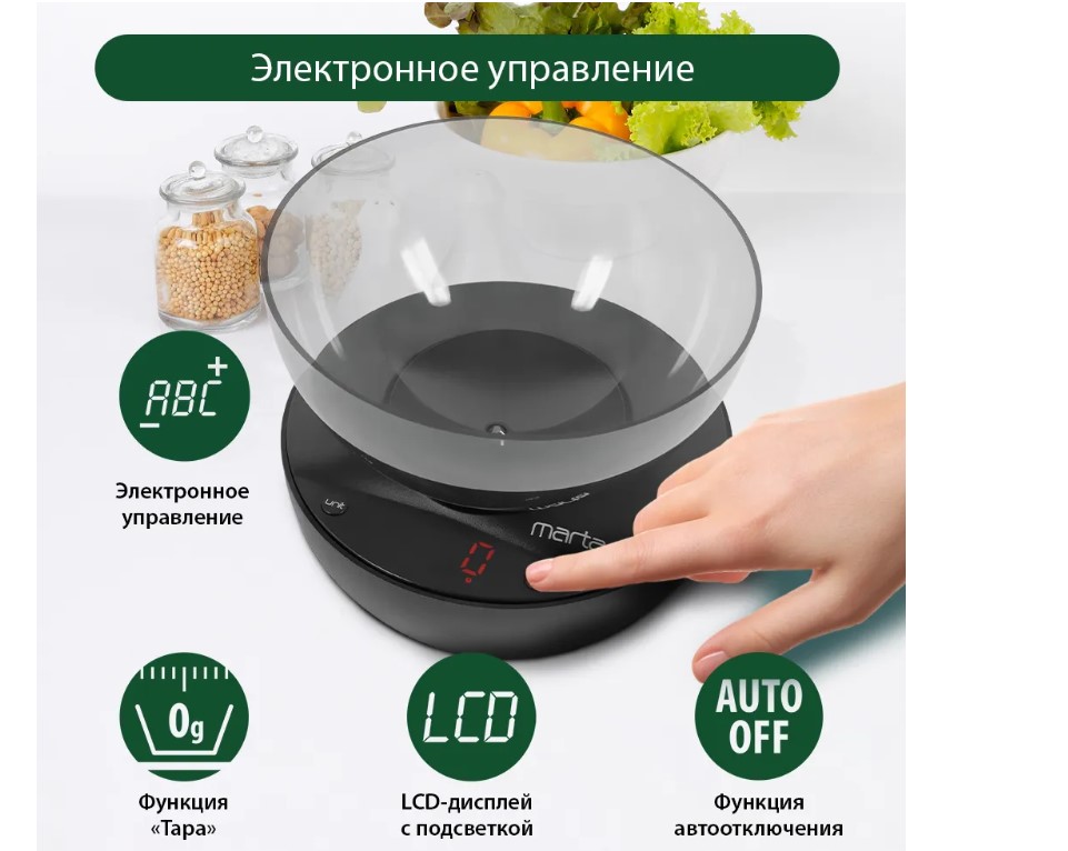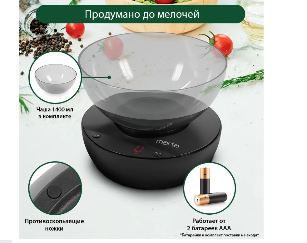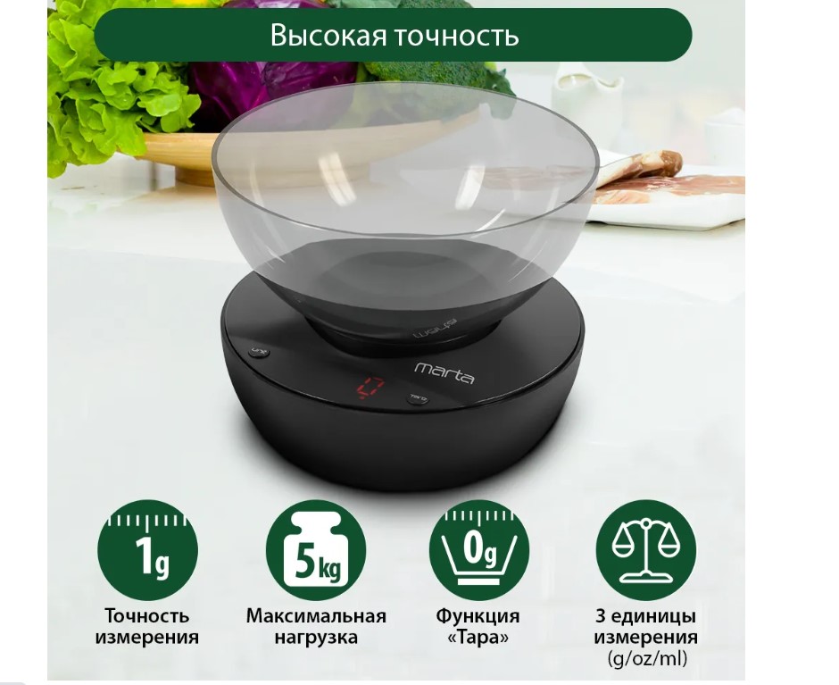 Кухонные весы с чашей и LED дисплеем. Обеспечивают надежное взвешивание продуктов массой до 5 килограммов с точностью до 1 грамма и способны работать в различных единицах измерения. Функция «ТАРА» позволяет производить последовательное взвешивание продуктов, а индикаторы перегрузки и замены батареи сделают работу весов бесперебойной в течение длительного времени. Кухонные весы MT-1648 – отличный помощник для тех, кто любит готовить точно по рецептам.