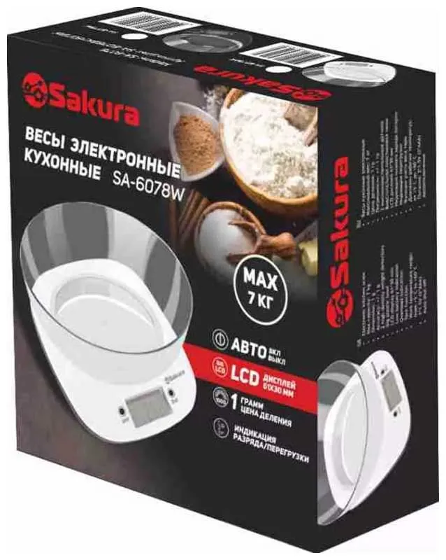 Весы кухонные электронные, максимальная нагрузка 7 кг, цена деления 1 г, погрешность +/- 1 г, LCD-дисплей, съёмная пластиковая чаша, резиновые ножки, 2 высокочувствительных датчика, четыре доступных единицы измерения (г/кг/фунт/унция), диапазон рабочих температур от +5°С до +60°С, ЖК дисплей, учет веса тары, автоматическое отключение, индикатор перегрузки и заряда батарейки, питание 2*1,5В (ААА).