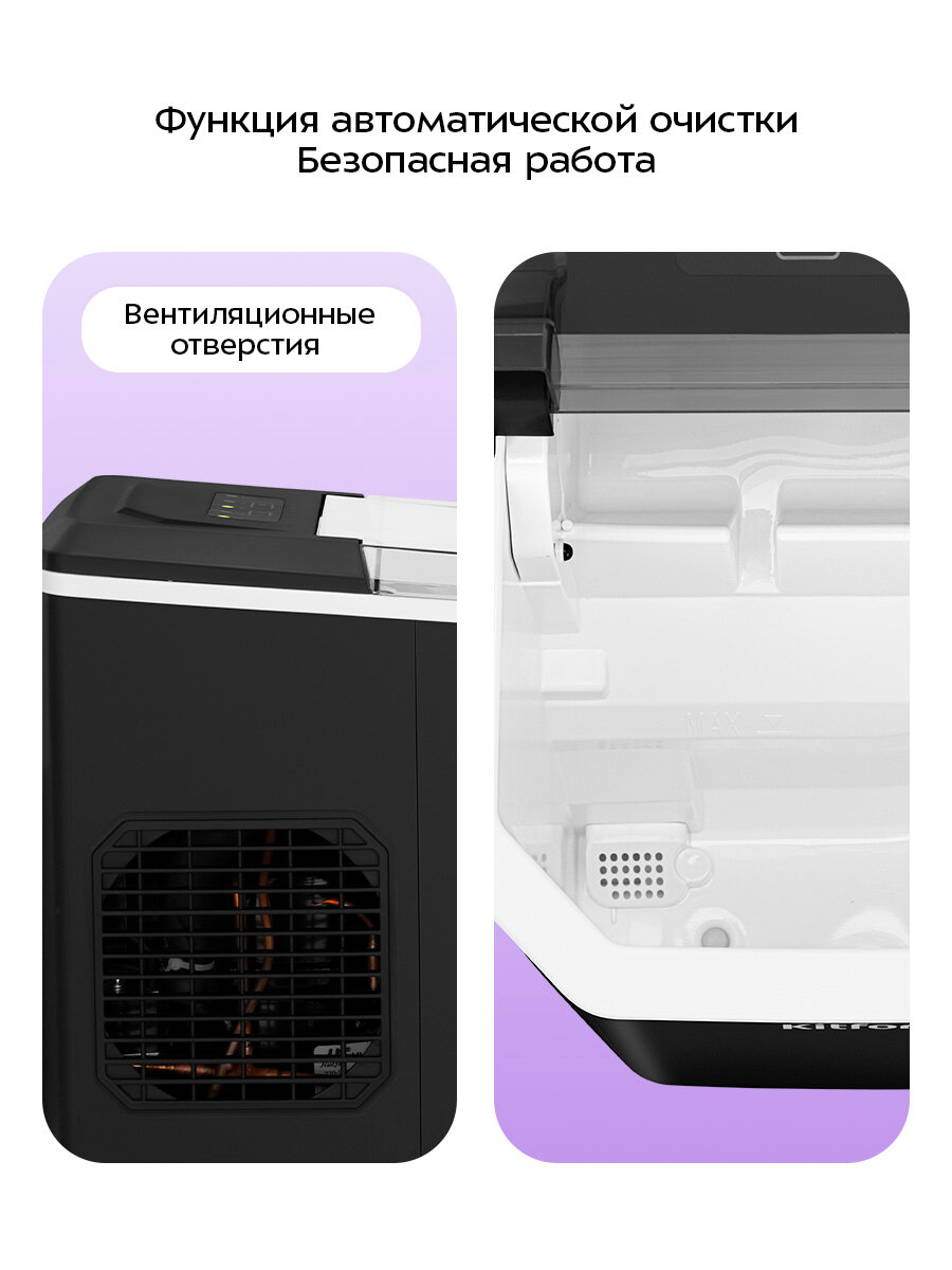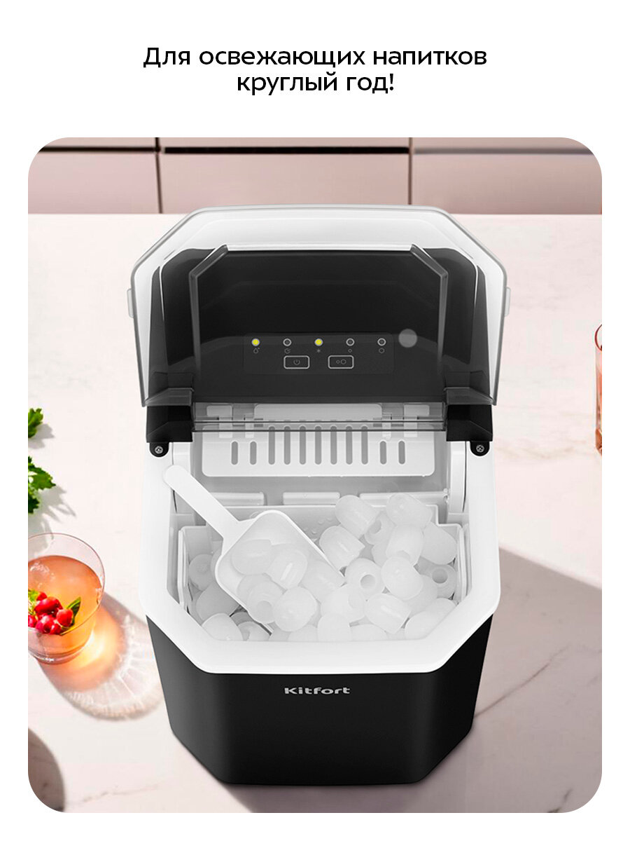 В устройстве предусмотрена функция автоматической очистки, это позволит легко ухаживать за прибором. У льдогенератора есть прозрачная крышка для наблюдения за процессом. Корзина для льда съёмная.