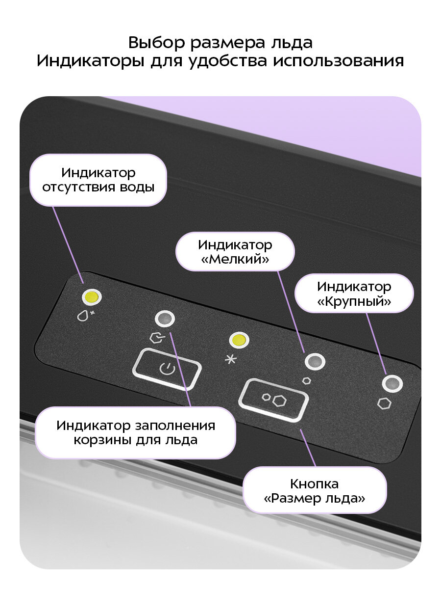 Кнопка «Размер льда» позволяет выбрать размер льда. Индикатор заполнения корзины для льда загорается, когда корзина полностью заполнилась. Когда в резервуаре для воды заканчивается вода, загорается индикатор отсутствия воды, генерация льда прекращается.