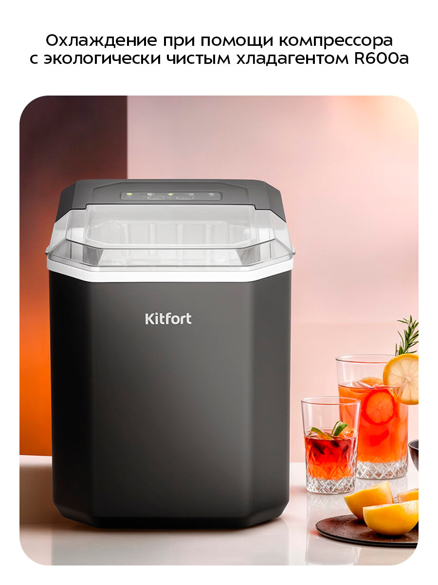 Охлаждение в приборе производится при помощи компрессора с экологически чистым хладагентом R600a по принципу обычного холодильника. Вам нужно просто залить чистую фильтрованную воду в резервуар и нажать кнопку. Остальное льдогенератор сделает сам!