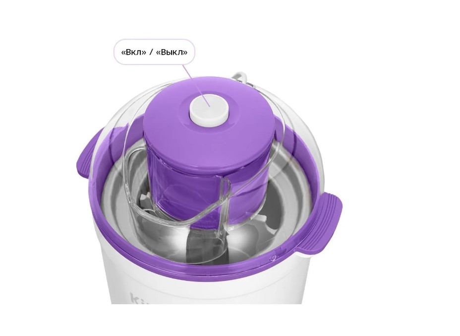 Крышка мороженицы изготовлена из прозрачного пластика, благодаря чему можно наблюдать за процессом приготовления. На моторном блоке расположена кнопка включения/выключения. Для удобства добавления ингредиентов в крышке есть загрузочное отверстие.