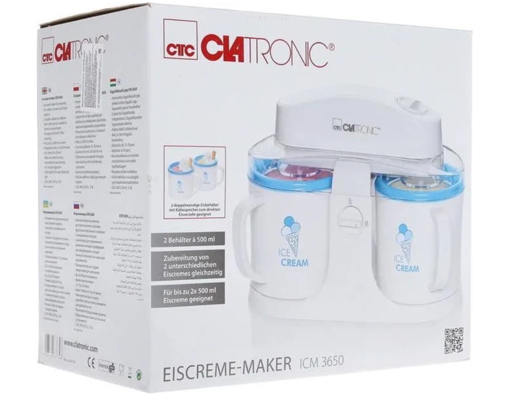 Clatronic ICM 3650 Weiss - это аппарат для приготовления мороженого, щербета, и замороженного йогурта. Прибор имеет две чаши для замораживания объемом 0.5 литра каждая. Ориентировочное время приготовления мороженого составляет 15-30 минут. Модель также оснащен прорезиненными ножками для более комфортной работы.