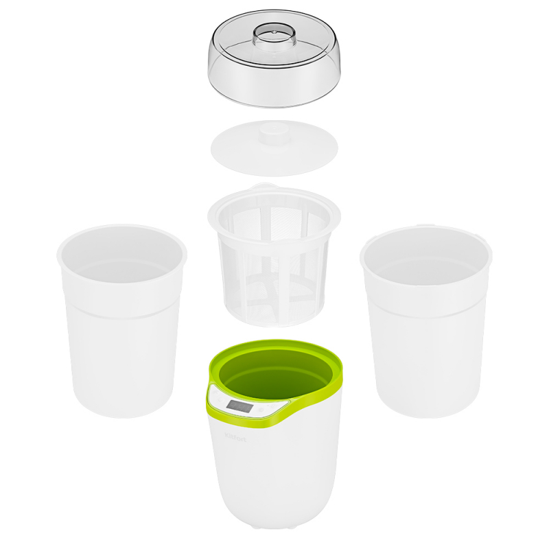 Прибор укомплектован 2 контейнерами на 1,8 ли 1,6 л с крышкой, в которых йогурт можно хранить в холодильнике. В комплекте также есть сито для приготовления греческого йогурта, творога или сыра. Все части легко разбираются, моются и компактно хранятся.
