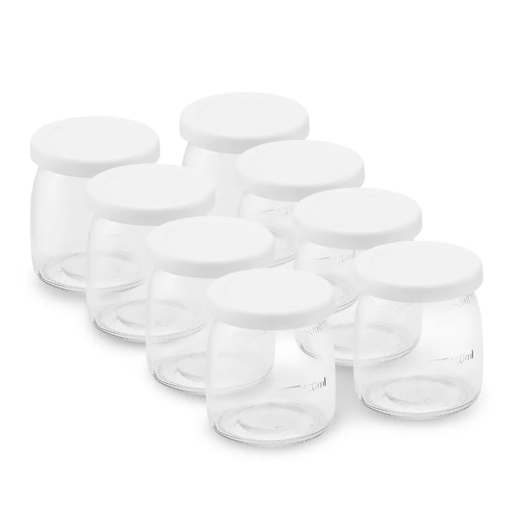 Прибор укомплектован 8 стеклянными баночками по 180 мл каждая, в которых готовый йогурт можно хранить в холодильнике. Стекло сохраняет натуральные свойства домашнего йогурта, а также является экологически чистым материалом.