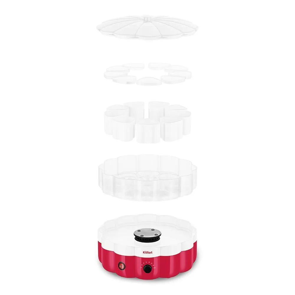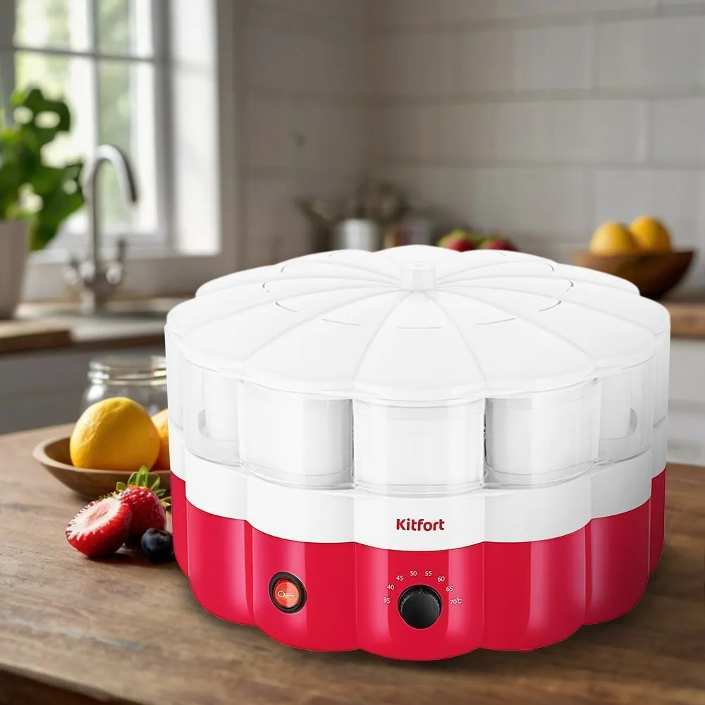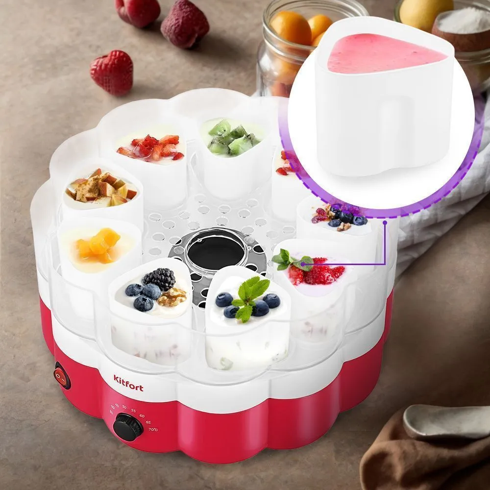 С помощью КТ-6395 можно много экспериментировать, используя разные закваски, например, для ряженки или творога. Фрукты, мюсли, орехи, ягоды, джем, шоколад дополнят нежный вкус любимого лакомства.