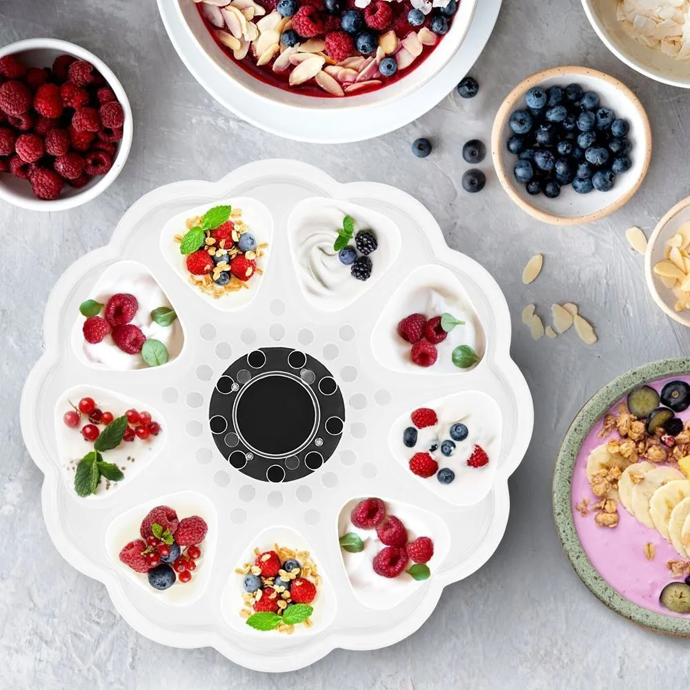 Прибор укомплектован 9 пластиковыми баночками по 120 мл, в которых можно хранить готовый йогурт в холодильнике. Крышки баночек выполнены из пластика.