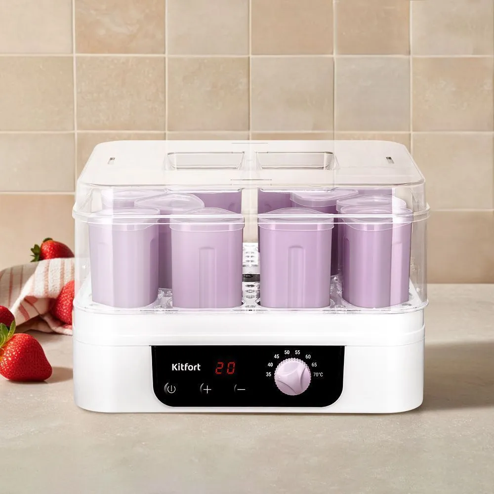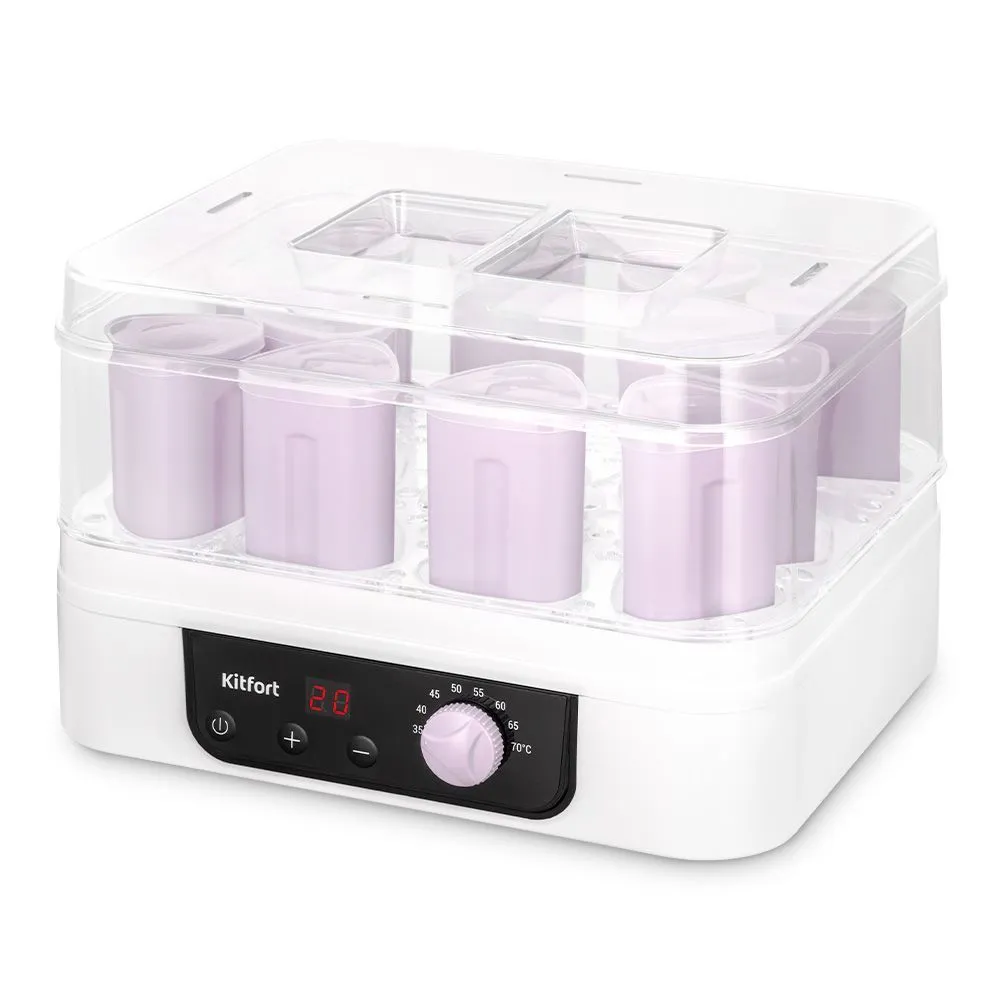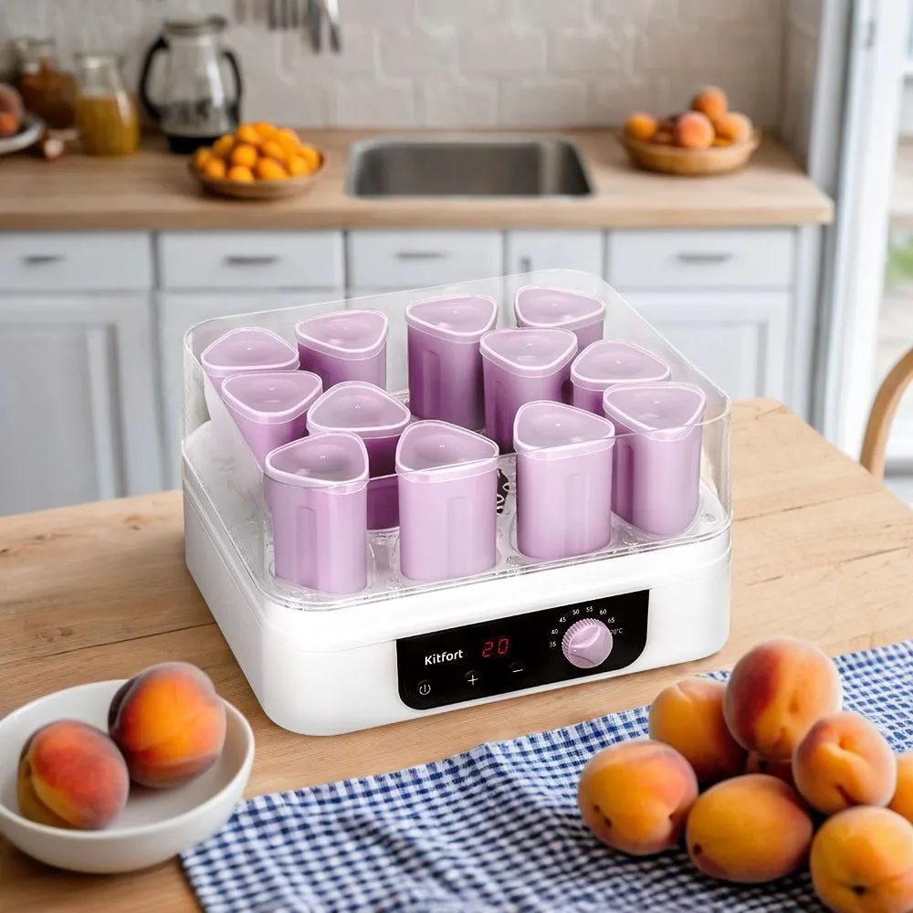 Йогуртница КТ-6396 предназначена для приготовления вкусного и полезного домашнего йогурта. Прибор укомплектован 12 пластиковыми баночками ёмкостью 200 мл каждая. Готовый йогурт можно хранить в холодильнике прямо в баночках.