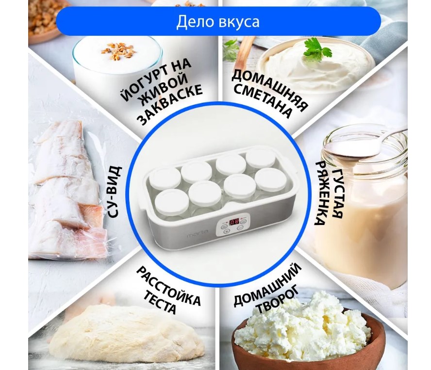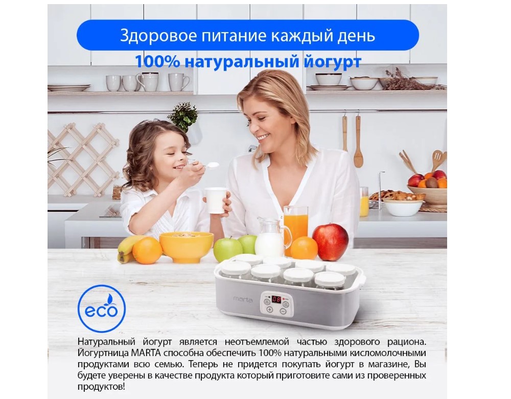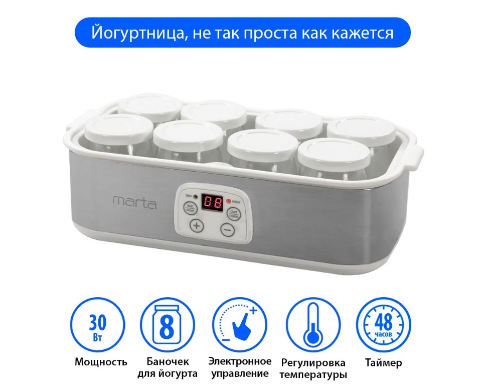 Отличный прибор для каждодневного приготовления живых йогуртов, кефира, ряженки, простокваши и других молочнокислых продуктов в домашних условиях без красителей консервантов и стабилизаторов. Комплект из 8-ми 180-граммовых стеклянных баночек с крышками надежно сохранит все полезные свойства продукта. С использованием программируемого до 48-ми часов таймера, можно добиваться различной консистенции получаемых продуктов, например, йогуртов – от легких питьевых до густых десертных. Звуковой сигнал сообщит о готовности, избавляя от необходимости следить за процессом приготовления. Йогуртница обеспечит вкусное и здоровое молочное питание на каждый день, что будет особенно полезно детям.