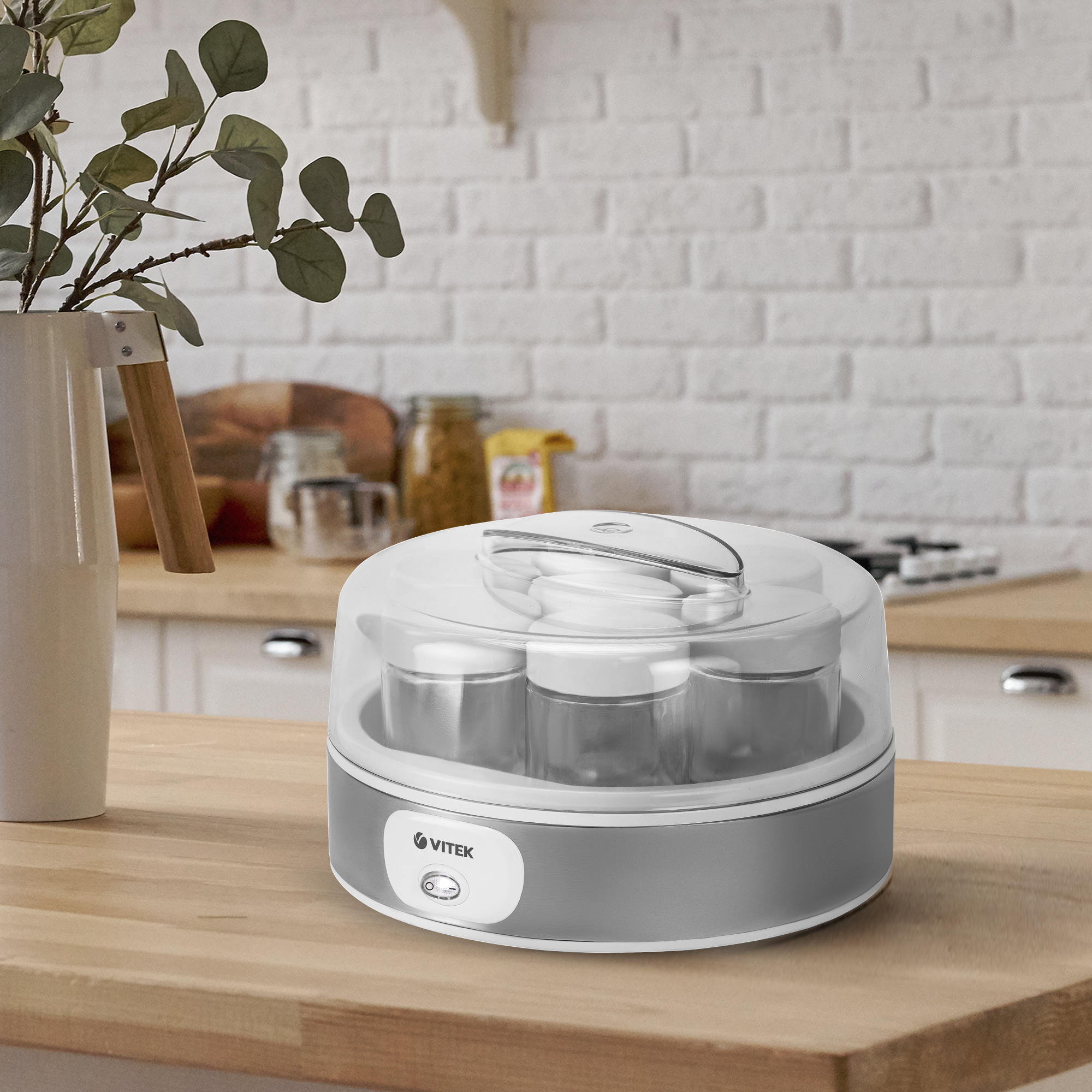 Следите за рационом питанием, стараясь делать его максимально полезным? Тогда йогуртница VITEK VT-2601 вам просто необходима! Будьте уверены: кисломолочные продукты, приготовленные в этом устройстве, обладают превосходным вкусом и густой консистенцией. Пользоваться прибором просто и легко! Возьмите пастеризованное цельное молоко и закваску, смешайте и затем разлейте по семи стеклянным баночкам емкостью 200 мл, входящим в комплект. После чего поместите их внутрь устройства, закройте и нажмите кнопку, расположенную на передней панели (загорится специальный индикатор). Благодаря оптимальной температуре (до 45°С±12°С) приготовление йогуртов протекает в правильных условиях, и они получаются просто идеально. Номинальная потребляемая мощность прибора — 18 Вт. Купите йогуртницу VITEK VT-2601: заботьтесь о своем здоровье со вкусом!
