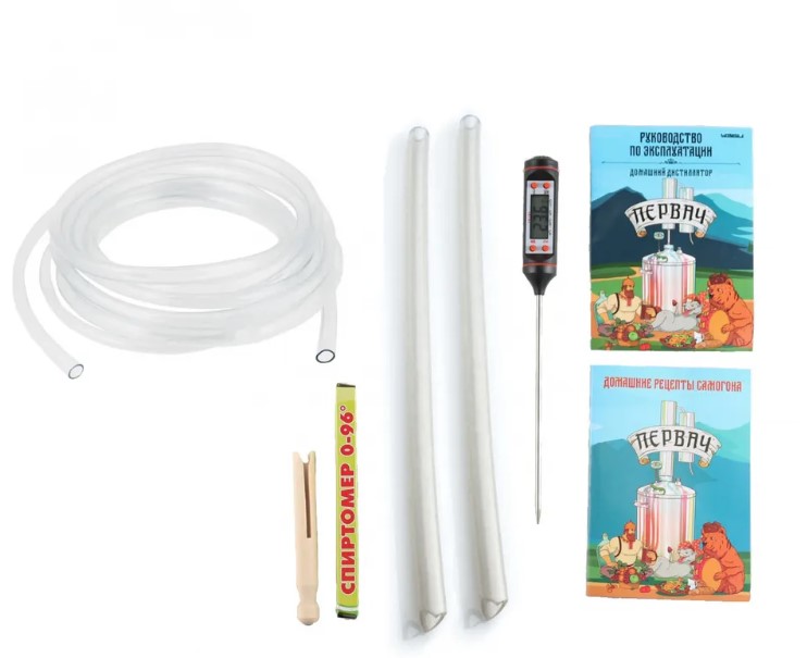 Комплектация: Перегонный куб 20 л - 1 шт, съемная крышка - 1 шт, надстройка сухопарник + охладитель - 1 шт, джин-корзина для ароматизации - 1 шт, силиконовая трубка для слива отходов - 1 шт, силиконовая трубка для выхода готового продукта - 1 шт, шланг ПВХ для подвода-отвода холодной воды - 1 шт, термометр цифровой - 1 шт, клапан сброса избыточного давления - 1 шт, деревянный зажим - 1 шт.