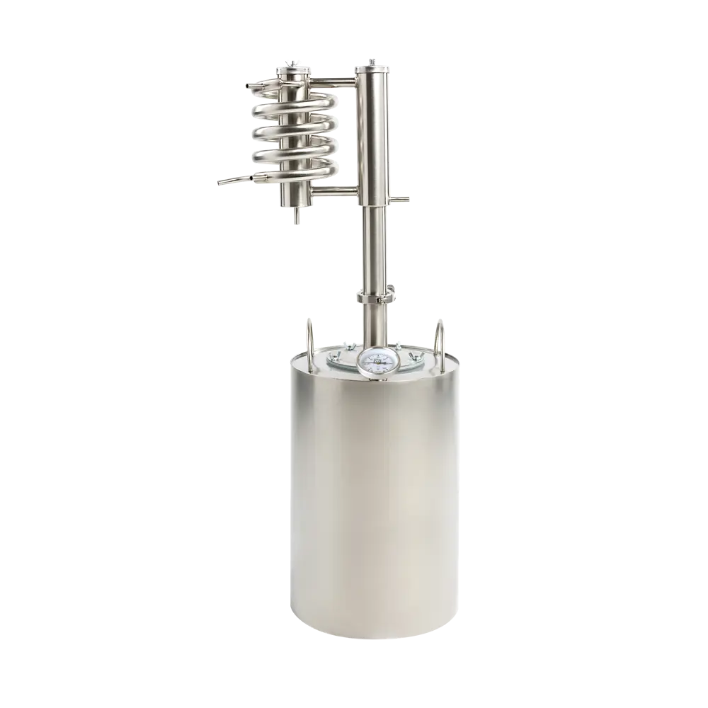 Данный аппарат обладает высокоэффективным холодильником «змеевик в змеевике», что позволяет очень экономно расходовать воду для конденсации спиртовых паров. Холодная проточная вода, циркулируя по внешнему контуру холодильника, вбирает в себя все тепло конденсируемого пара, который движется по внутреннему контуру холодильника.