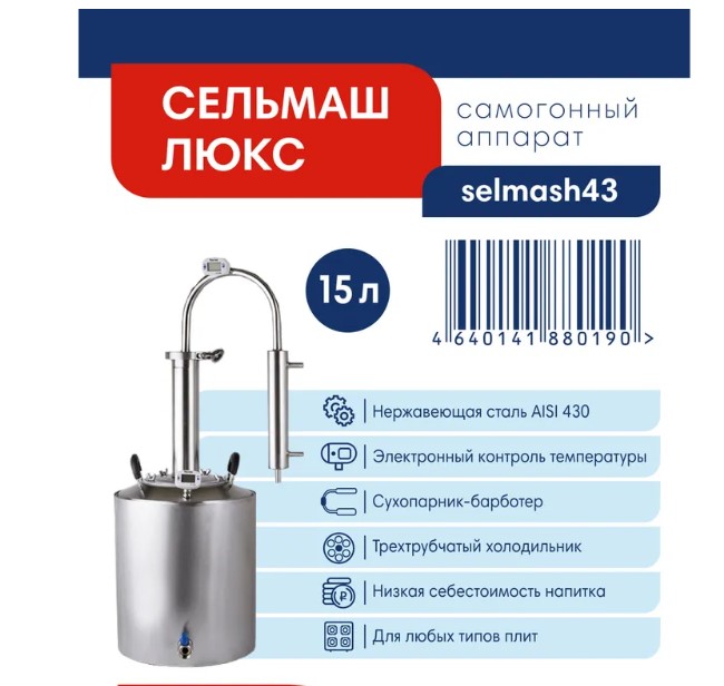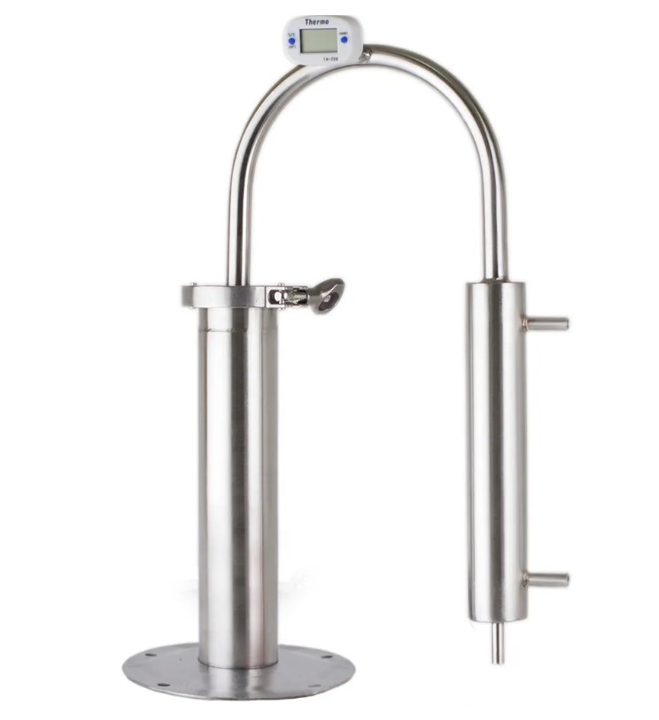 Два электронных термометра. Термометр на баке показывает температуру кипения браги, а термометр в верхней части – температуру отбираемых паров с точностью до 0.1°. В продукт попадает только чистый спирт.