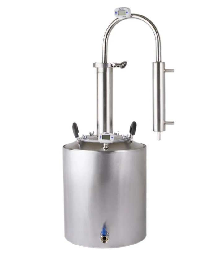 Два электронных термометра. Термометр на баке показывает температуру кипения браги, а термометр в верхней части – температуру отбираемых паров с точностью до 0.1°. В продукт попадает только чистый спирт.