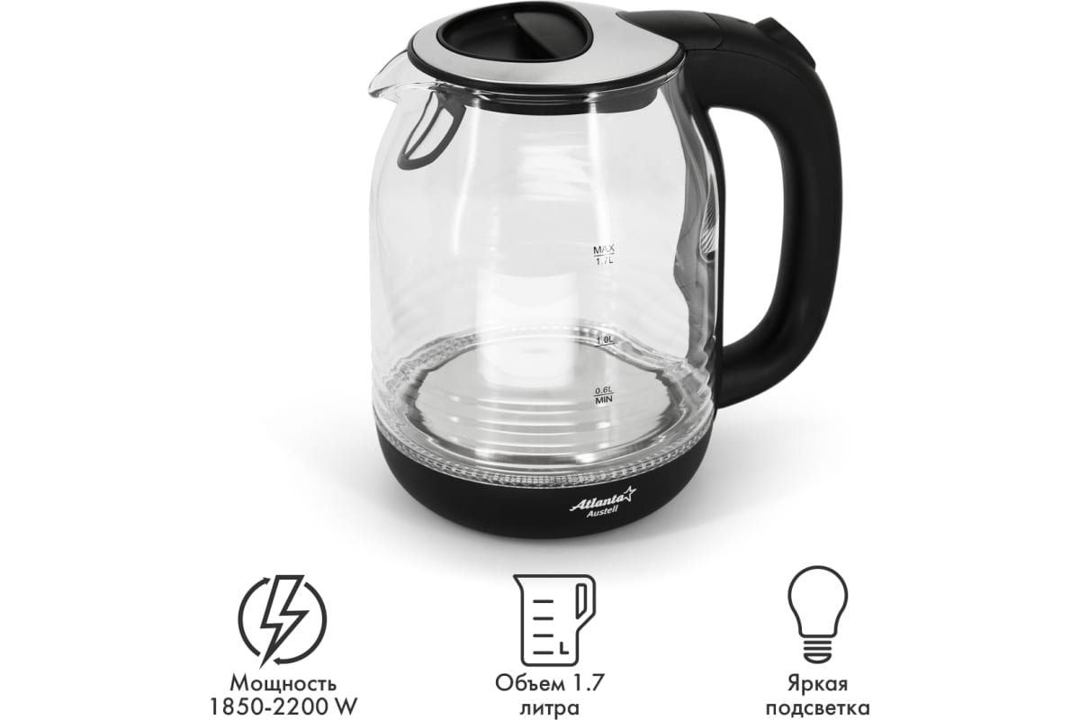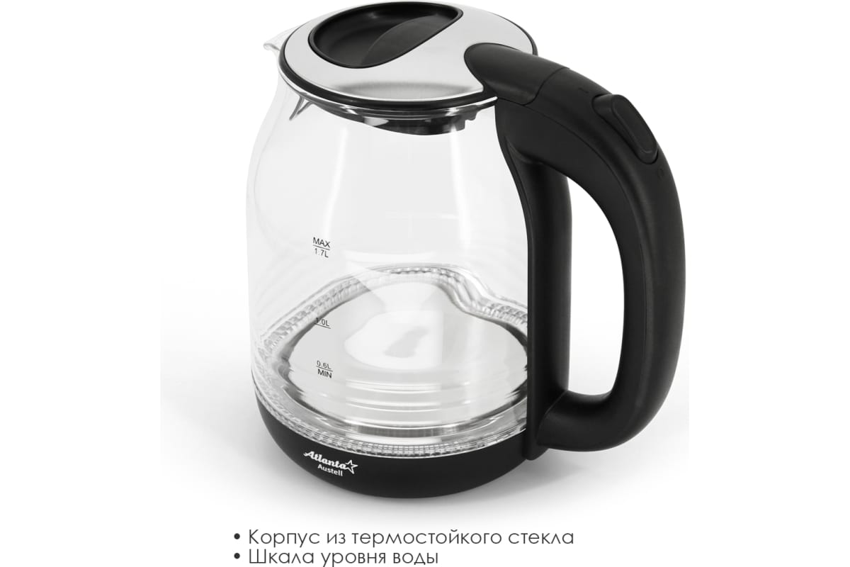 Стеклянный электрический чайник Atlanta ATH-2469 black предназначен для кипячения и подогрева воды.