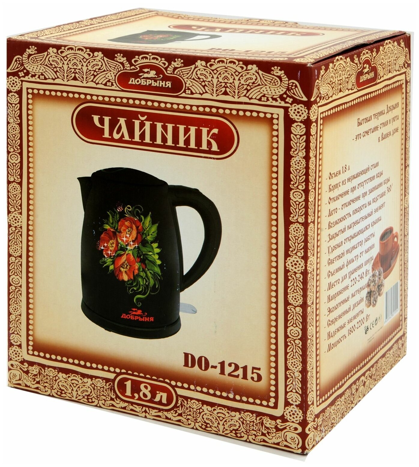 Металлический корпус, скрытый нагревательный элемент, отличная вместительность – это основные достоинства, которые характерны для электрического чайника Добрыня DO-1215. О том, что чайник работает, вам подскажет специальный индикатор, который загорается при включении устройства. Чайник Добрыня дополняется удобной подставкой, которая не требует определенного положения техники.