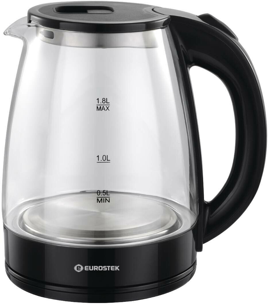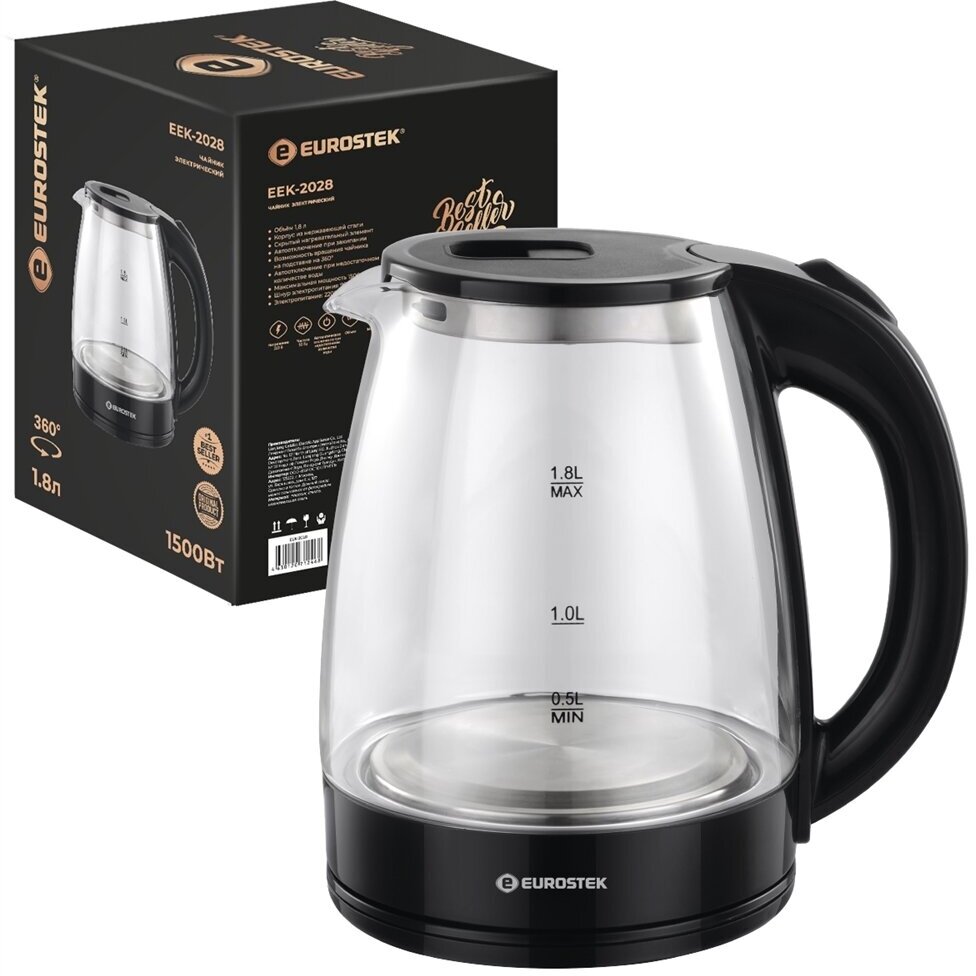 Электрический чайник Eurostek EEK-2033 в бежевом EEK-2028 в черном цвете. Объем 1,8л, мощность: 1500 Вт, LED-подсветка, корпус из жаропрочного стекла, диск, кнопка открывния крышки, световая индикация работы, с автоматическое отключение при закипании, автоматическое отключение без воды, вращение на подставке на 360°.