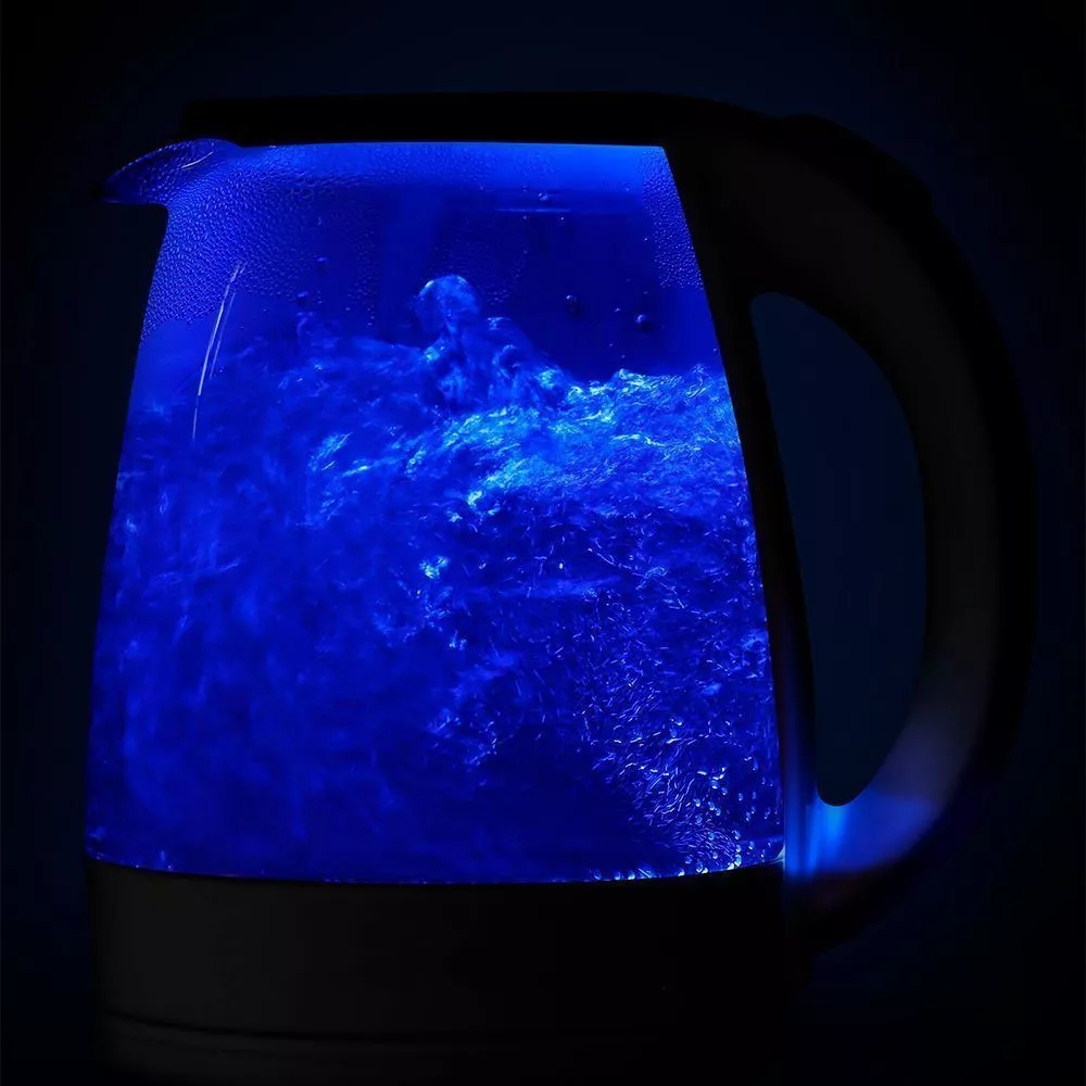 При включении чайника по периметру дна загорается синяя подсветка, которая является индикатором работы и одновременно художественно подсвечивает кипящую воду.