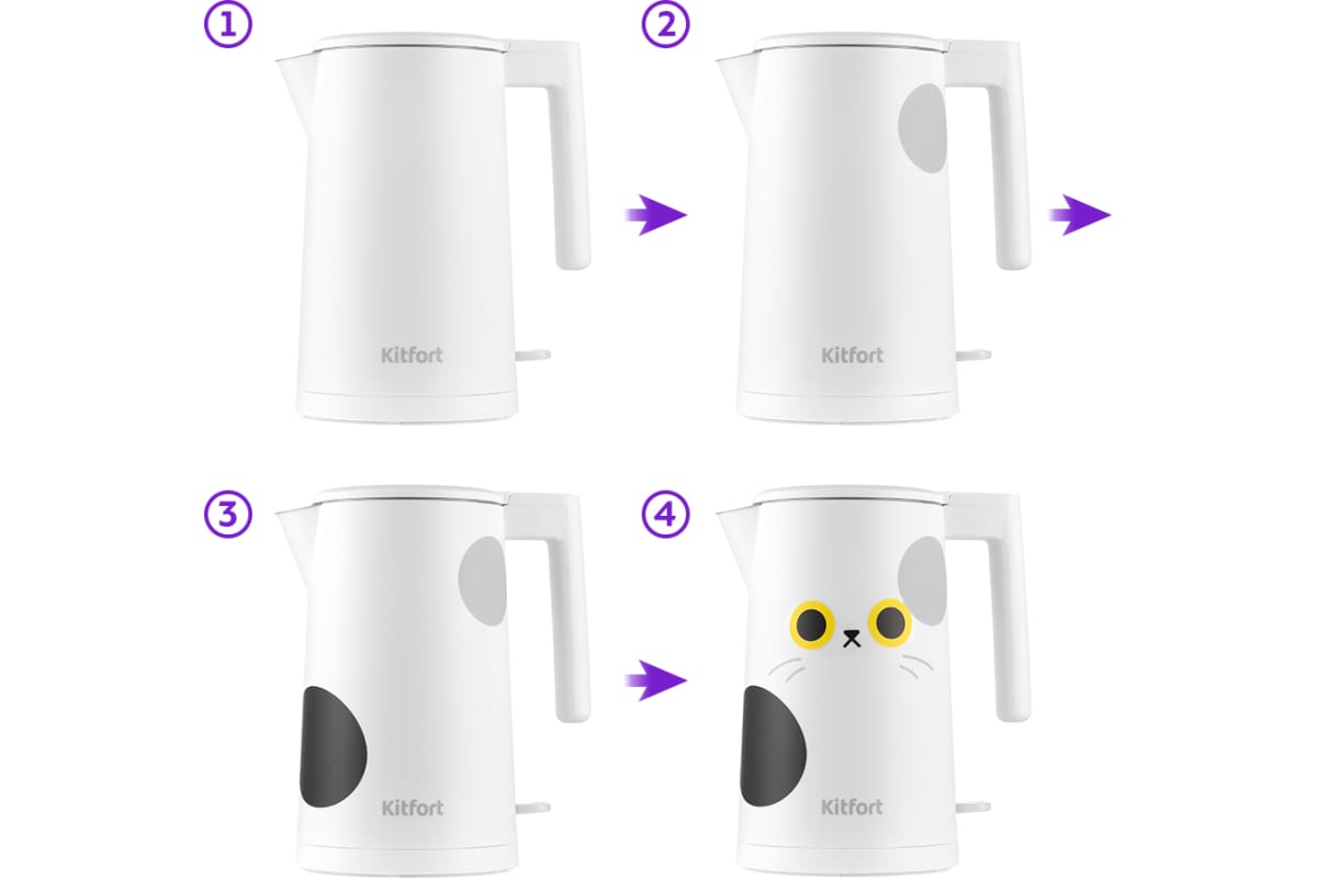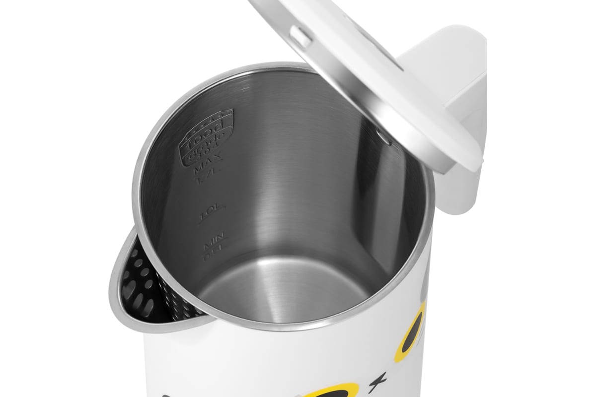 Мерная шкала в виде отметок MAX и MIN находится внутри корпуса чайника. Ручка чайника пластиковая, не нагревается и удобно лежит в руке. Кнопка открывания крышки расположена на крышке, а кнопка включения — под ручкой. Нагревательный элемент (ТЭН) у этой модели чайника скрытый и находится в донной части. Сверху он закрыт специальной металлической пластиной из нержавеющей стали, благодаря которой исключается прямой контакт ТЭНа с водой. Такая конструкция препятствует образованию накипи, облегчает уход и значительно снижает шум при нагревании воды. Снизу имеется отсек для хранения шнура, в который можно смотать излишки шнура электропитания, чтобы он не мешал на столе. Чайник автоматически отключается при закипании, имеет защиту от перегрева и от включения без воды. При закипании воды образующийся пар попадает в паропровод, проходит по нему и затем воздействует на термодатчик, который отключает чайник. Такая конструкция позволяет чайнику отключаться при закипании воды независимо от альтитуды (высоты над уровнем моря). Во время кипячения рекомендуется держать крышку плотно закрытой, иначе данный механизм может работать неправильно.
