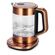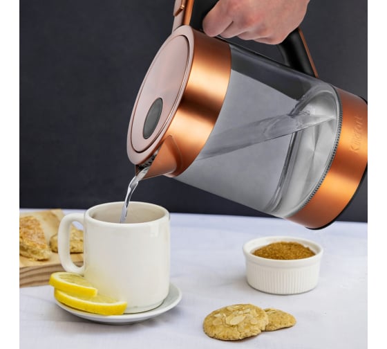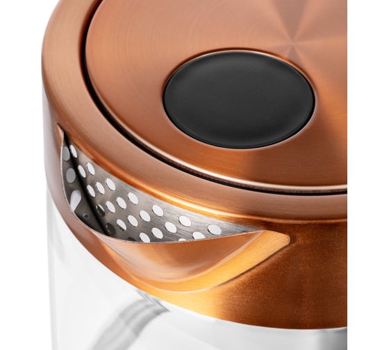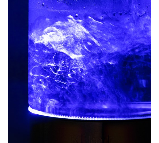 Чайник автоматически отключается при закипании и при снятии его с подставки. Корпус чайника выполнен из нержавеющей стали, а подставка — из сочетания пластмассы и нержавеющей стали. Большой диаметр отверстия облегчает доступ при мойке. Ручка чайника имеет эргономичную форму и выполнена из термостойкого пластика. При включении чайника синяя подсветка по периметру дна сигнализирует о его рабочем состоянии, а также красиво подсвечивает воду. Корпус чайника выполнен из стекла и нержавеющей стали. В носике чайника расположен фильтр, который задерживает частички накипи и предотвращает их попадание в чашку.