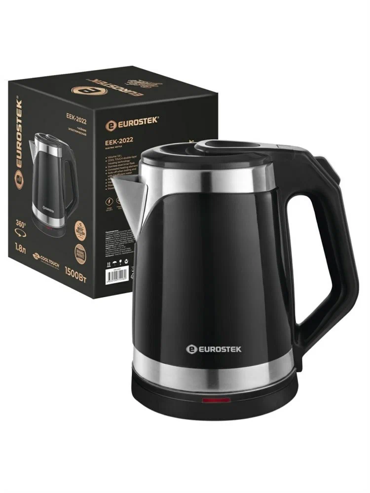 Электрический чайник Eurostek EEK-2021 в белом цвете и EEK-2022 в черном цвете. Объем 1.8 л , мощность: 1500 Вт, двойной корпус из нержавеющей стали и пластика, кнопка открывания крышки, шкала уровня воды, дисковый нагревательный элемент, световая индикация работы, вращение чайника на подставке на 360, автоматическое отключение при закипании и при недостаточном количестве воды.