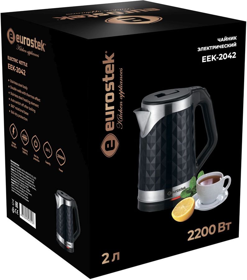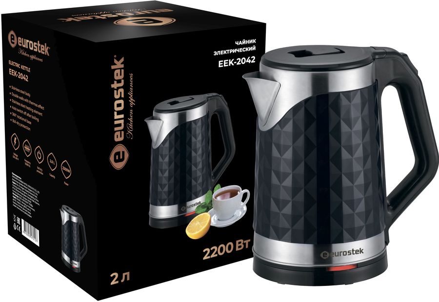 Объем 2,0 л, мощность: 2200 Вт, двойной корпус, материал внутренней стенки – нержавеющая сталь, наружное покрытие -высококачественный пластик, нагревательный элемент из нержавеющей стали, автоматическое отключение при закипании, вращение на подставке на 360°, защита от перегрева.