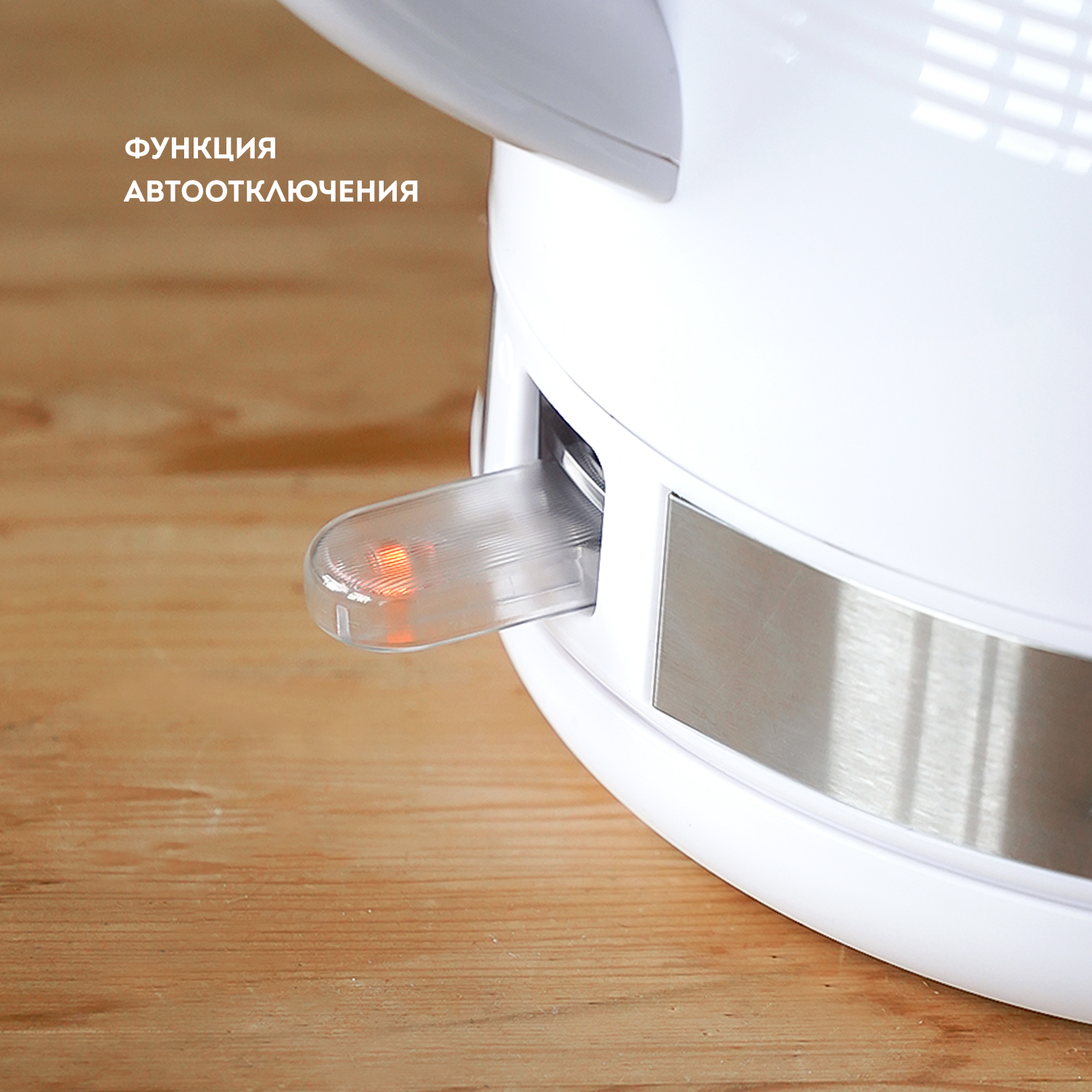 Скрытый нагревательный элемент из высококачественной нержавеющей стали 18/10, наличие функций автоотключения при закипании и отсутствии воды гарантируют безопасное использование и долгий срок службы чайника.