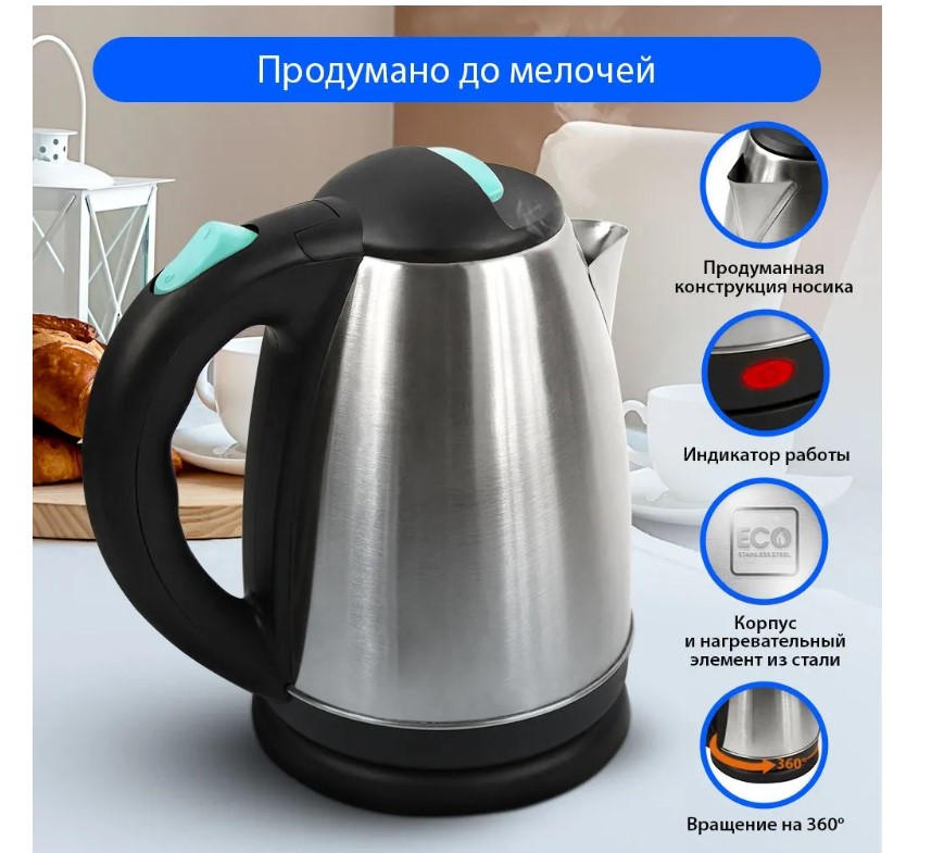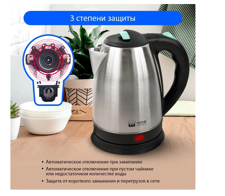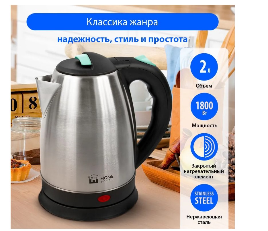Отличный чайник объемом 2 литра для большой семьи, мощностью 1800 Вт. Вскипятит воду быстро. Автоматика отключит чайник, если в нем нет воды или она вскипела! Для удобства пользования чайник снабжен индикатором работы. Закрытый нагревательный элемент избавит от коррозии и накипи.