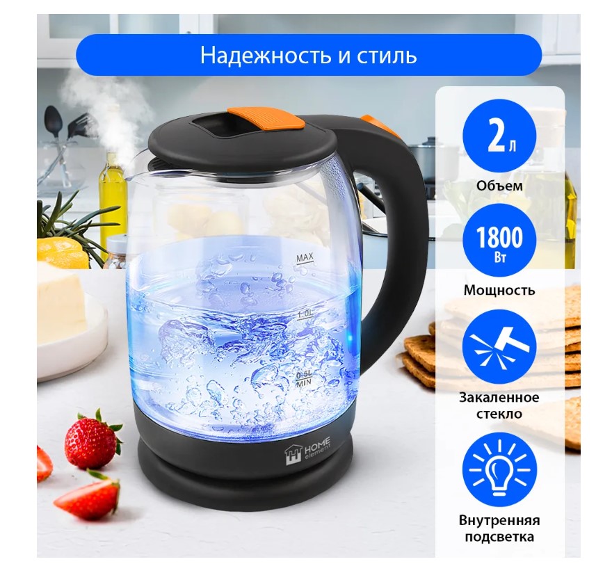Легкий и прочный стеклянный чайник с голубой внутренней подсветкой в стильном прозрачном корпусе из закаленного стекла. Качественное стекло сохраняет природный вкус и все натуральные свойства воды, не выделяя примесей. Двухлитровый чайник имеет повышенную мощность 1.8 кВт для самого быстрого закипания воды и закрытый нагревательный элемент для противостояния накипи и легкости ухода. Вращение чайника на базе обеспечивает простой доступ к его ручке с любой стороны без опасности обжечься, а многоуровневая система защиты автоматически отключит чайник при готовности кипятка или при недостаточном количестве воды. Светодиодная подсветка дарит прекрасное настроение игрой света в пузырьках закипающей воды.