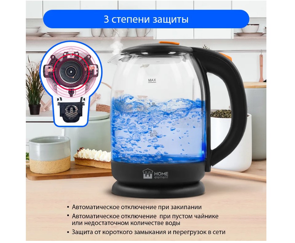 Автоматическое отключение при закипании или недостаточном количестве воды обезопасит чайник от преждевременного выхода из строя. Вы сможете доверить управление чайником даже ребенку.